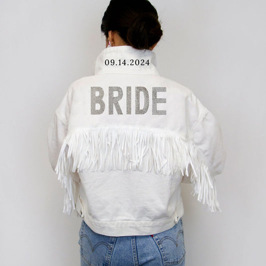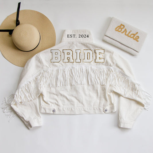 (White Fringe) Personalized Bridal White Fringe Denim Jacket