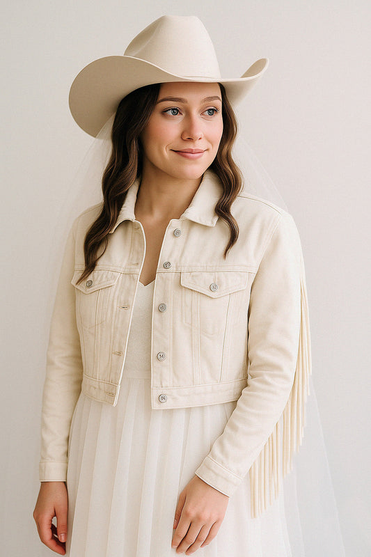 (White Fringe) Custom White Fringe Denim Jacket for the Bride