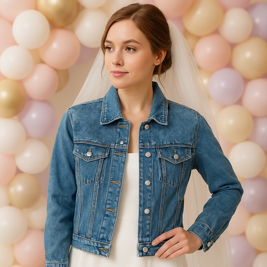 Bridal denim jackets are commonly worn for bachelorette trips, rehearsal dinners, wedding exits, engagement photos, and cool-weather ceremonies.