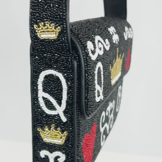 Modern, chic, and endlessly artistic — this gold abstract Queen of Hearts shoulder bag reinvents the classic card design. Featuring a geometric take on the queen's face in rich red, navy, and metallic gold beads, it’s a wearable piece of art. Ideal for creative fashionistas and card lovers alike.