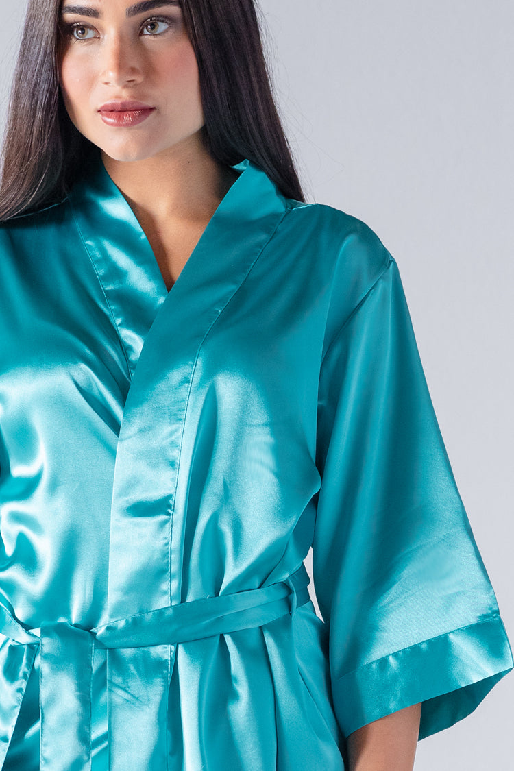 Silky chic and beautifully stitched Aqua Blue Satin Kimono Robe at an affordable price point. Perfect as a Bridesmaid Robe or favor and available to be customized or shipped as is.