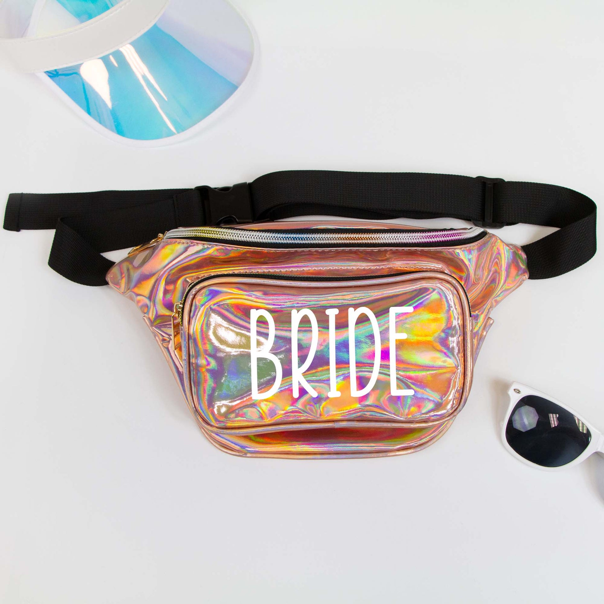 Super cute holographic fanny packs perfect for your next beach vacation, bachelorette party weekend, or pool party. With two pockets that can close with zippers and a hefty strap that can be adjusted, our fanny packs will help carry any essentials so you don’t have to have your hands full. Customization of the front pocket of our fanny packs are also available in a variety of fonts to choose from. Make your next beach bach party unforgettable with uniquely personalized fanny packs.