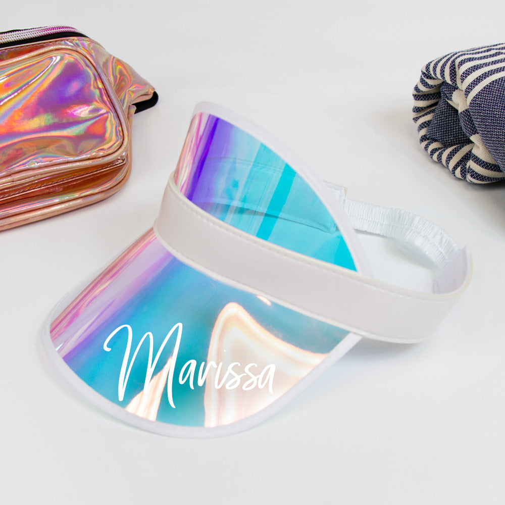 Fun and colorful holographic visors perfect for your beach bachelorette or next pool party! Made of blue, purple, and pink tinted plastic, white structural fabric, white customizable vinyl, and an elastic band that adjusts to your head, these sun visors are the perfect getaway gift for anyone looking to be stylish by the water. Personalization on our visors is also available! Choose from a variety of fonts to make your sun shade unique for a special summer trip or beach bach party. This must-have accessory is essential for your next beach bash.