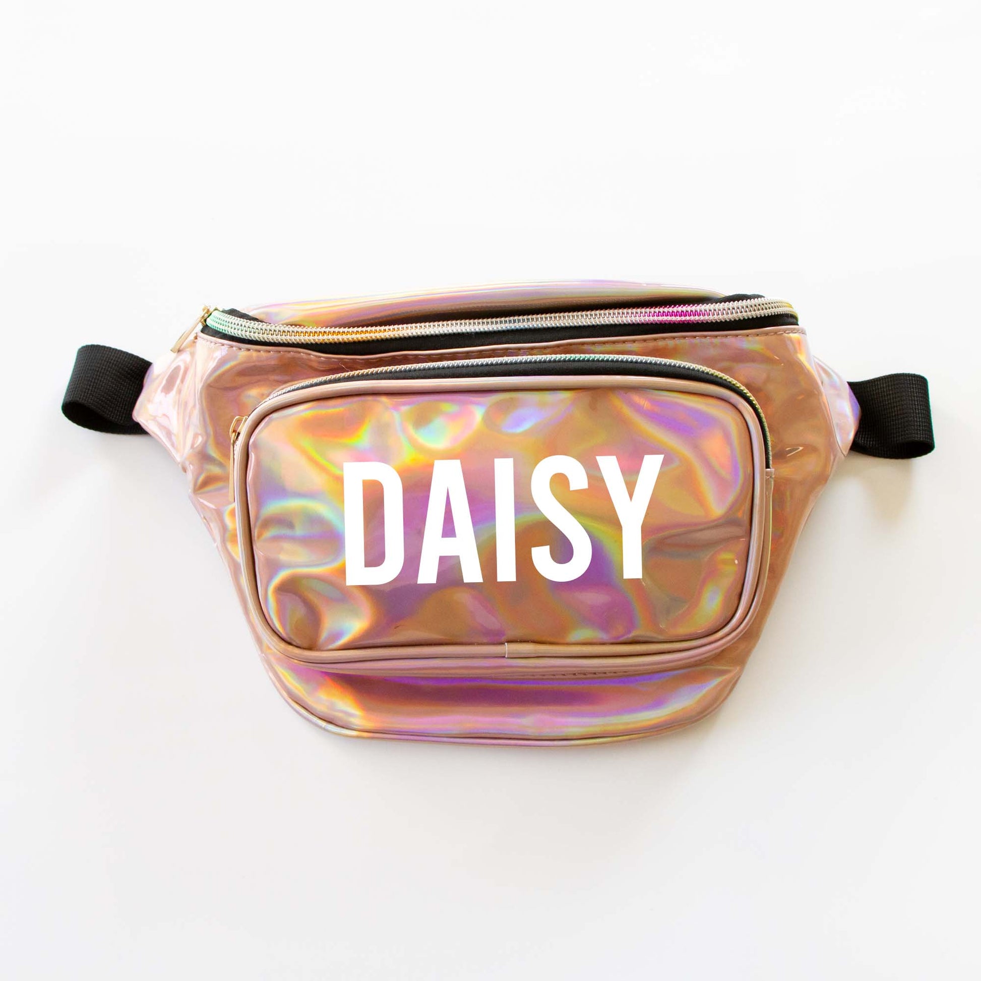 Super cute holographic fanny packs perfect for your next beach vacation, bachelorette party weekend, or pool party. With two pockets that can close with zippers and a hefty strap that can be adjusted, our fanny packs will help carry any essentials so you don’t have to have your hands full. Customization of the front pocket of our fanny packs are also available in a variety of fonts to choose from. Make your next beach bach party unforgettable with uniquely personalized fanny packs.