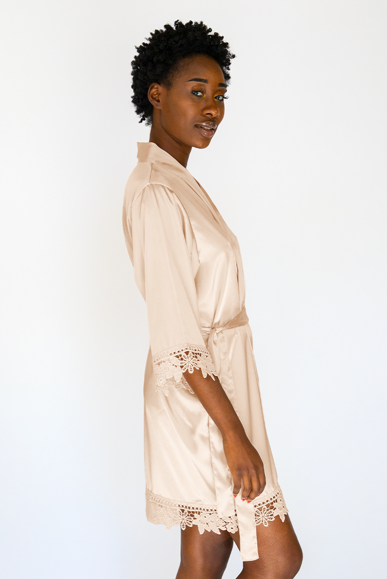 The made-to-order scalloped lace satin robe retains all the qualities you love about a traditional satin robe--soft, comfortable, luxurious--while featuring a slight upgrade to its look. This stylish item is perfect for lounging on your day-offs or for living it up with your girls on a Bachelorette party!