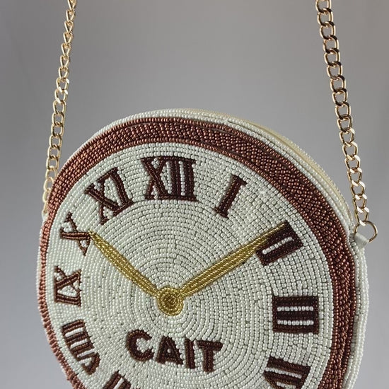 Timeless style meets playful whimsy with our Beaded Clock Purse, a conversation-starting piece that adds vintage elegance to your everyday look. Carefully hand-beaded in soft ivory and rich brown tones, this purse captures the beauty of a classic timepiece, complete with delicate Roman numerals and the option to personalize it with your initials or a meaningful word—making it a truly one-of-a-kind keepsake.