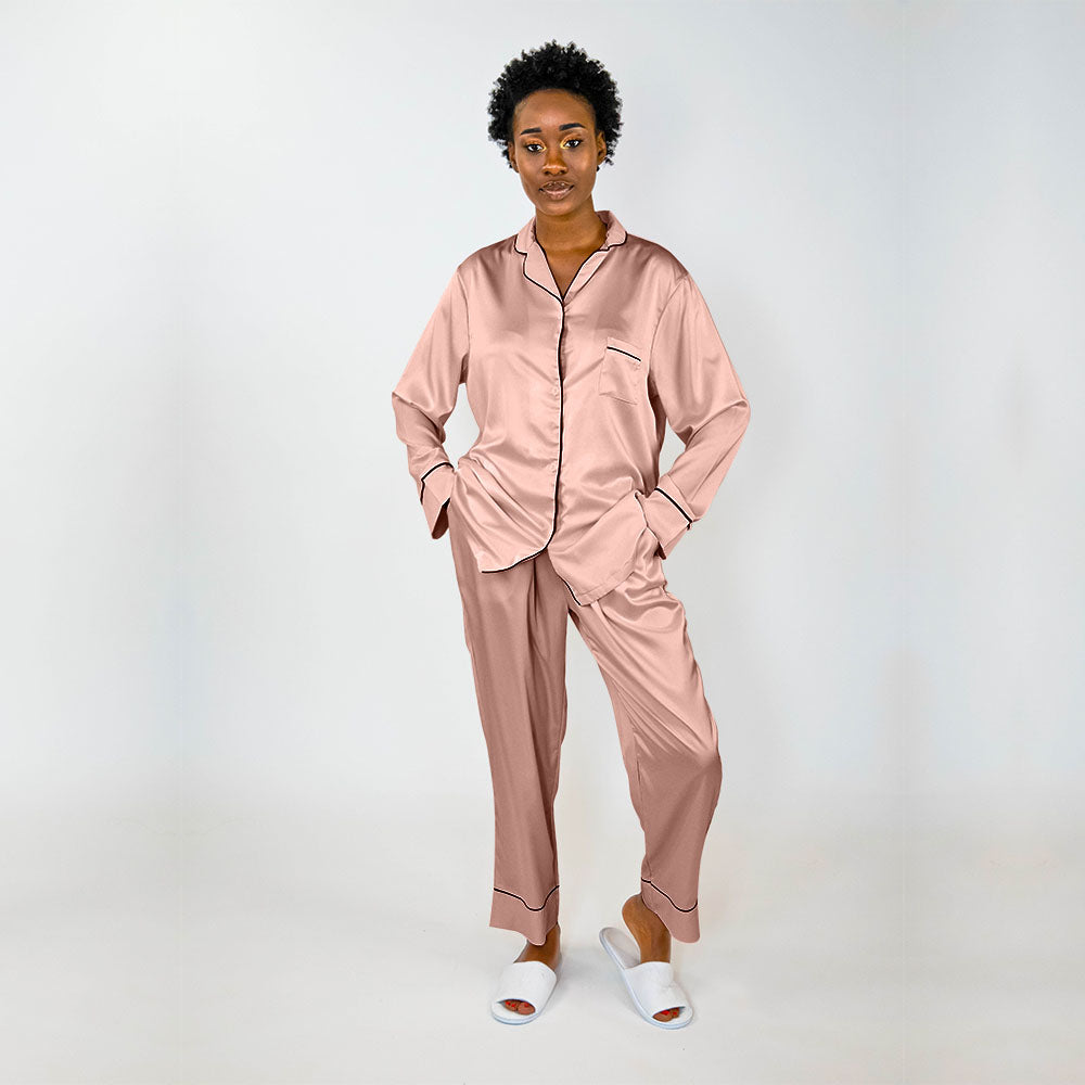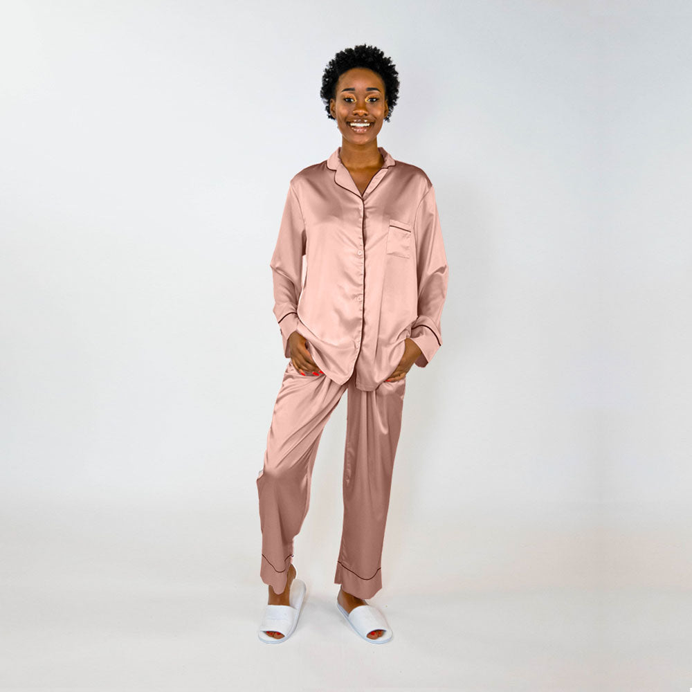 Our 2 piece Matte Satin Pajama Set is the perfect wedding day alternative to robes you've been searching for. Our bridesmaid pjs are made from breathable lightweight matte satin give your pjs a mute and more elegant look and feel - one that your bridesmaids will absolutely love. Our pjs are a gift you bridesmaids will appreciate long after the wedding. The pajama fabric color is contrasted by piping which adds a decadent touch to the pjs.