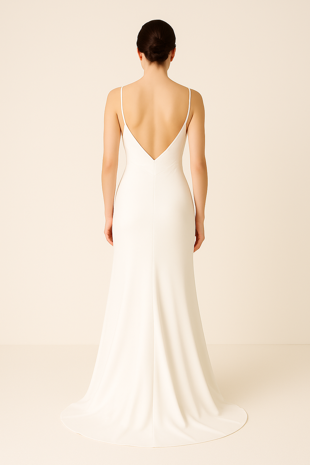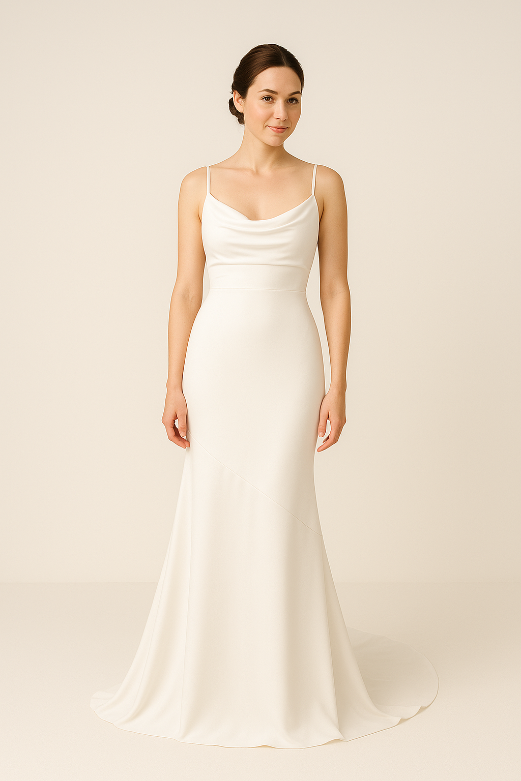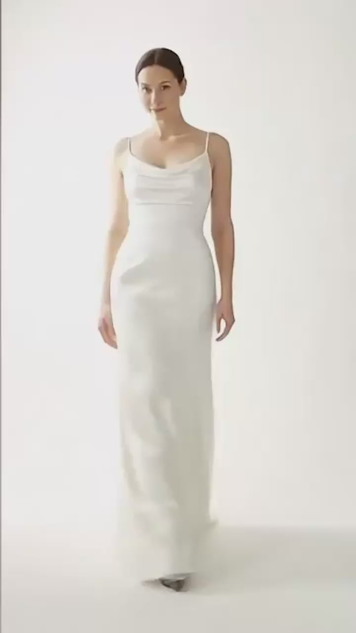 Understated elegance meets modern romance in this minimalist cowl neck wedding dress. With a draped satin neckline and slim spaghetti straps, this gown offers a soft, romantic feel while maintaining a sleek and structured silhouette. The fitted bodice flows into a smooth, figure-skimming skirt that gracefully flares into a gentle train. A plunging low back adds just the right amount of drama, perfect for the bride seeking timeless sophistication with a contemporary twist. Ideal for modern weddings, elopements, or chic city celebrations.