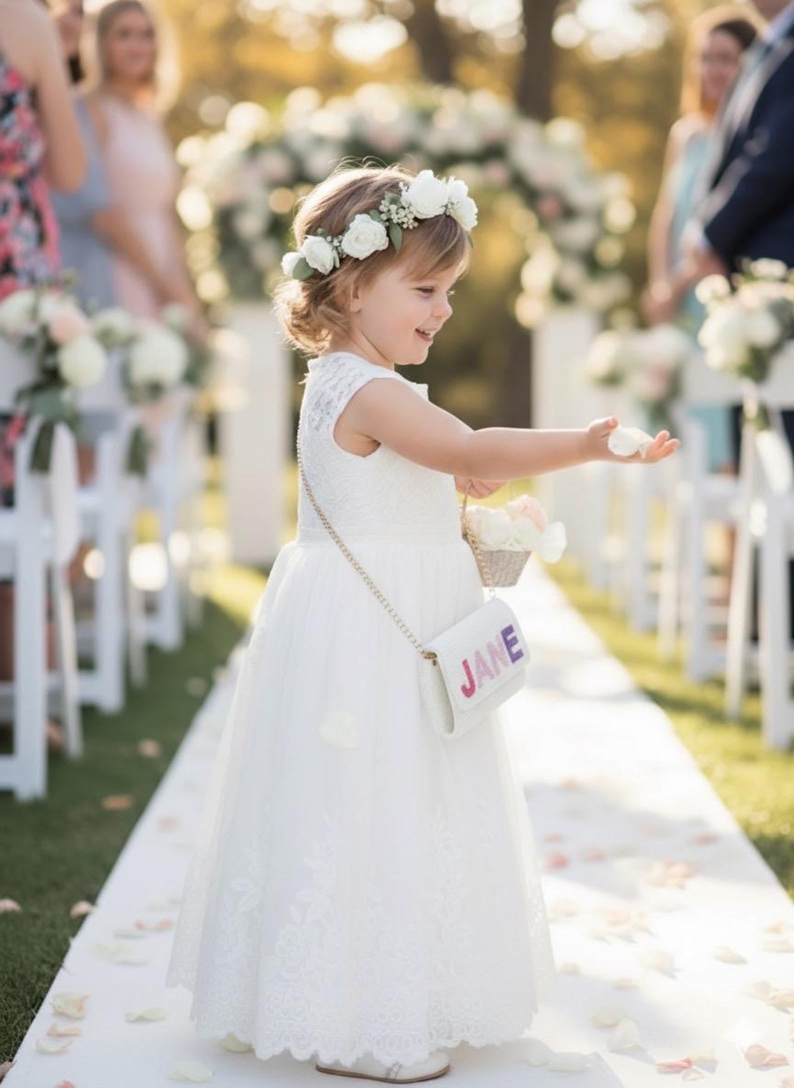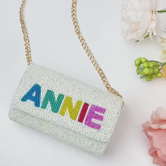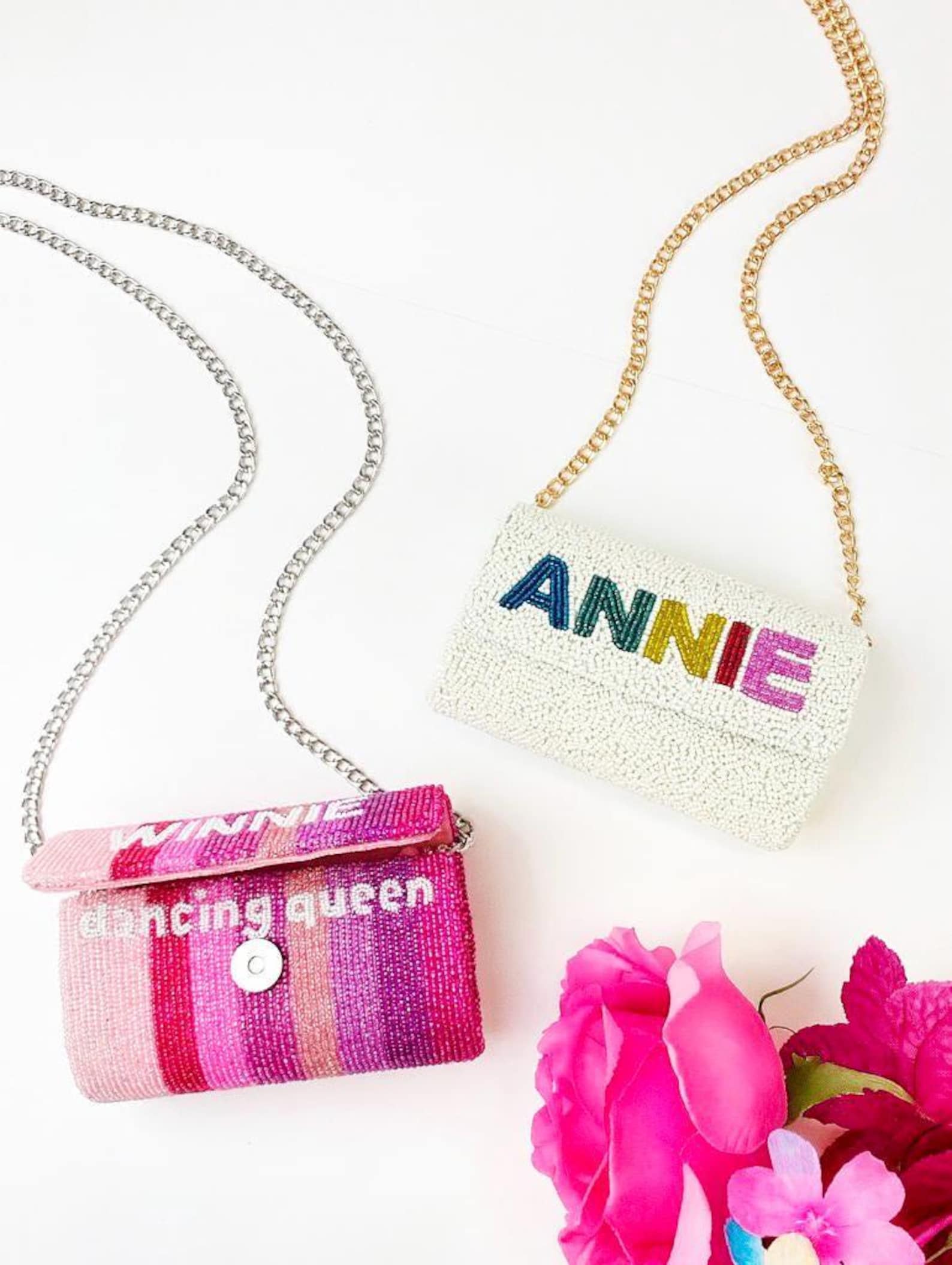 A meaningful custom beaded clutch designed to capture your favorite memories! This beautiful set features a white beaded clutch with gold lettering for the bride and a pink beaded clutch with “I LOVE YOU” on the front and a fully personalized photo inside. Perfect for wedding day keepsakes, gifts for mom or daughter, or a unique bridesmaid present. Complete with a gold chain strap, this purse is both elegant and sentimental — a true one-of-a-kind accessory.