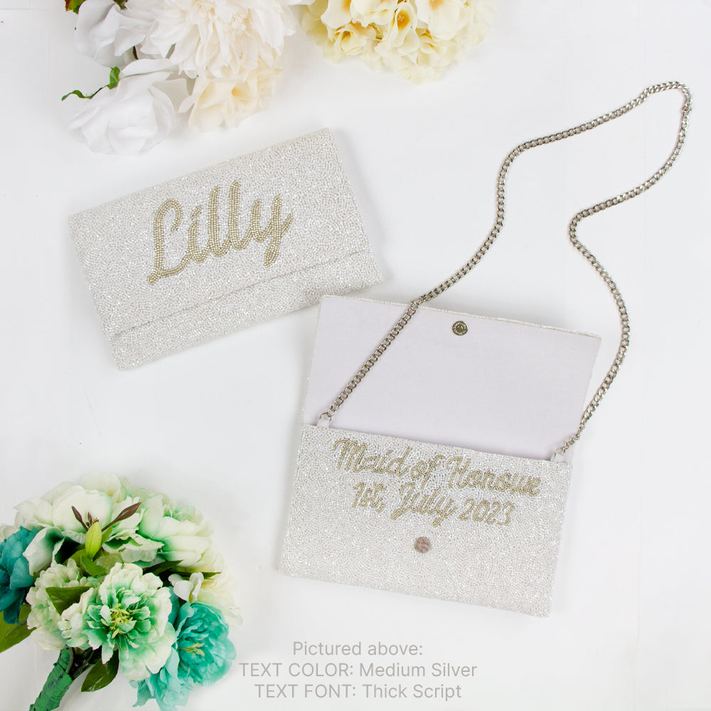 This Custom Bridesmaid Beaded Clutch Bag will be perfect on your wedding day! This beaded wedding clutch purse is handmade to perfection and has an intricate pattern that gives an elegant and classy addition to any outfit. From everyday essentials to special events, this handy bridal purse can carry all your necessities throughout the exciting occasion with ease. Get this bridal clutch handbag for yourself or surprise the bride on her most-awaited day!