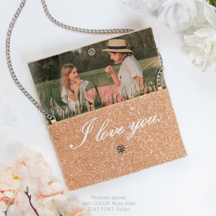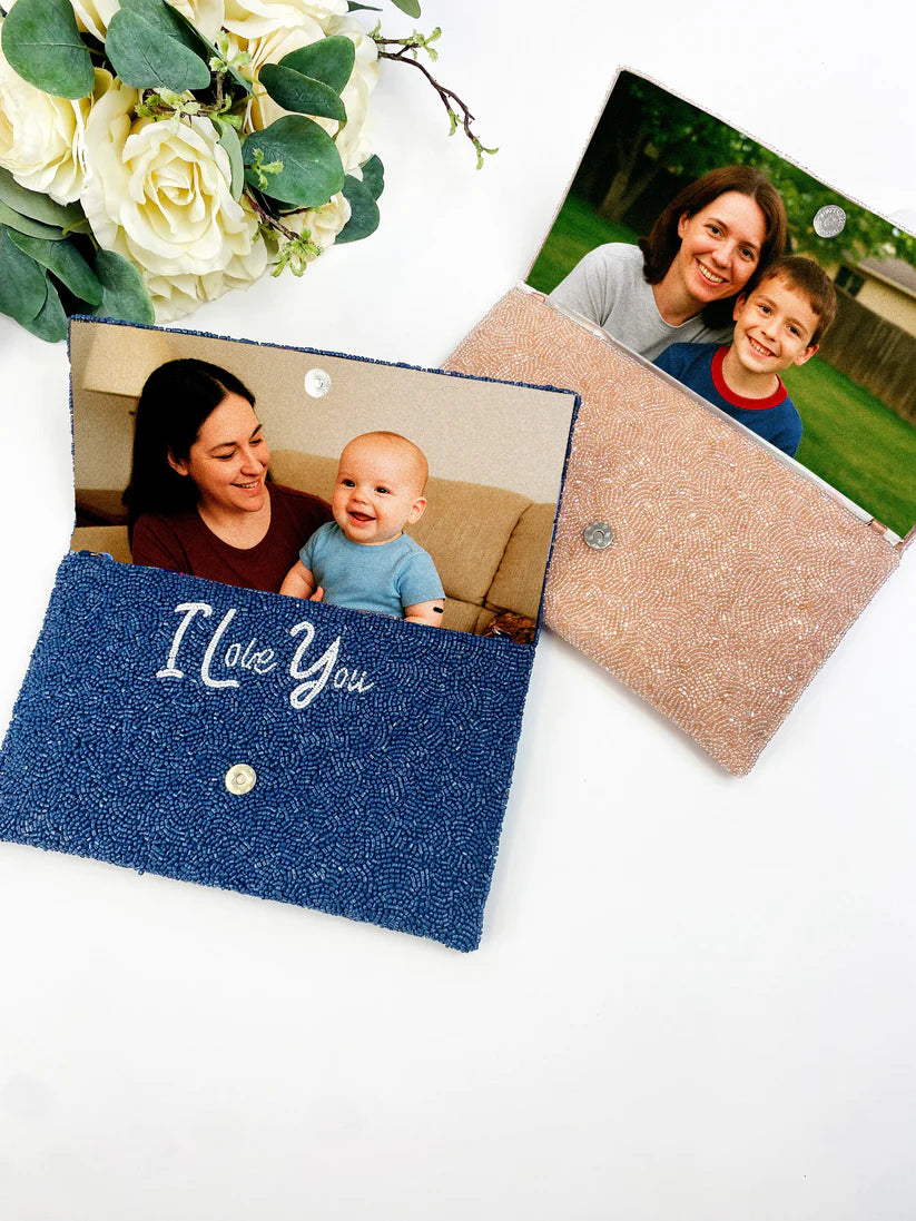This Custom Clutch Gift for Moms is the perfect gift for Mother's Day or as a special treat for the Mother of the Bride! Handcrafted with meticulous attention to detail, it features an intricate beaded pattern that adds a sophisticated touch to any outfit. Spacious enough to carry all the essentials, this clutch combines style and practicality, making it an ideal choice for celebrating a memorable occasion. Treat your mom or the mother of the bride to this beautiful and timeless accessory!