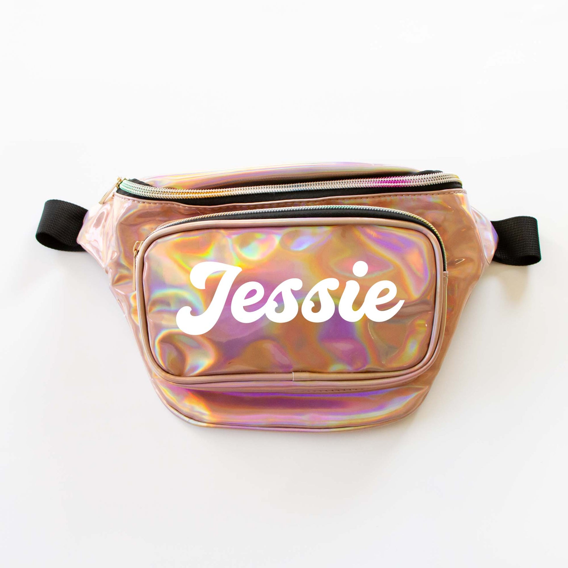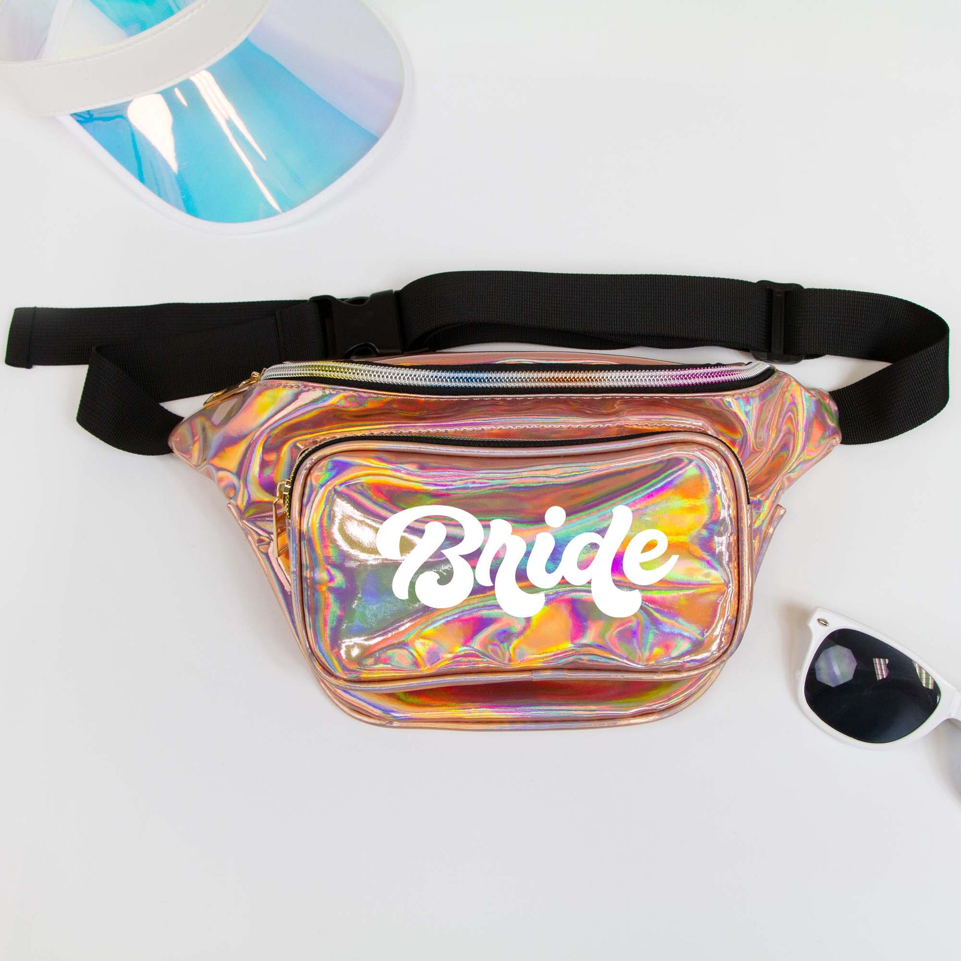 Super cute holographic fanny packs perfect for your next beach vacation, bachelorette party weekend, or pool party. With two pockets that can close with zippers and a hefty strap that can be adjusted, our fanny packs will help carry any essentials so you don’t have to have your hands full. Customization of the front pocket of our fanny packs are also available in a variety of fonts to choose from. Make your next beach bach party unforgettable with uniquely personalized fanny packs.