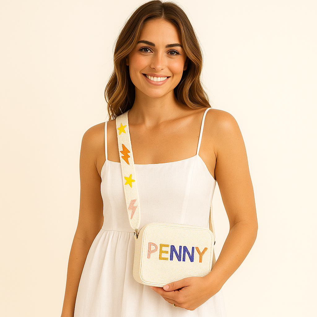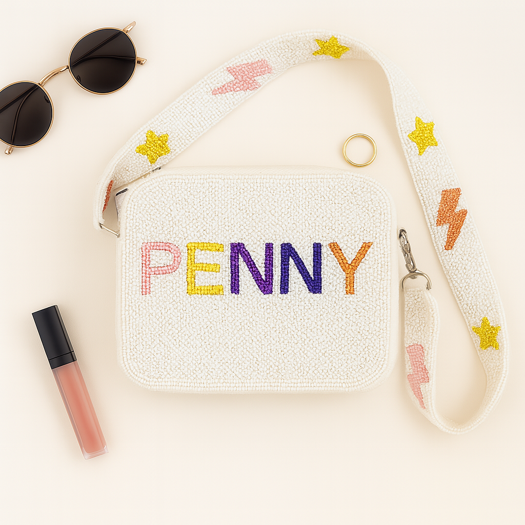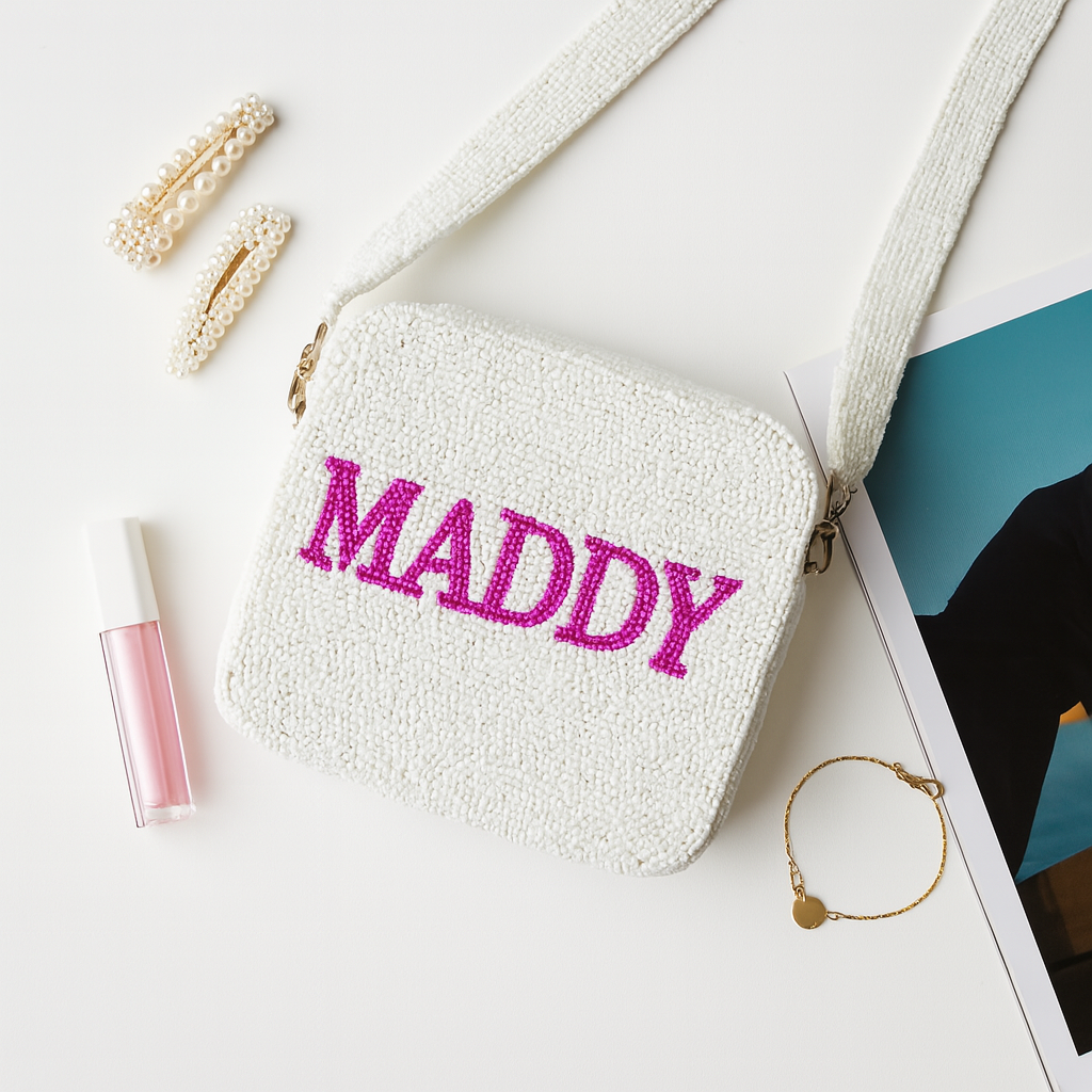 This Custom Name Seed Bead Crossbody Bag (GD) is the cutest accent piece for summer days or a night out. Being able to fully customize this purse and purse strap makes a great gift for a friend, sister, mom, or a bride! The shoulder strap is a removable full length strap for a crossbody style and has a zipper closure to keep your items secure.