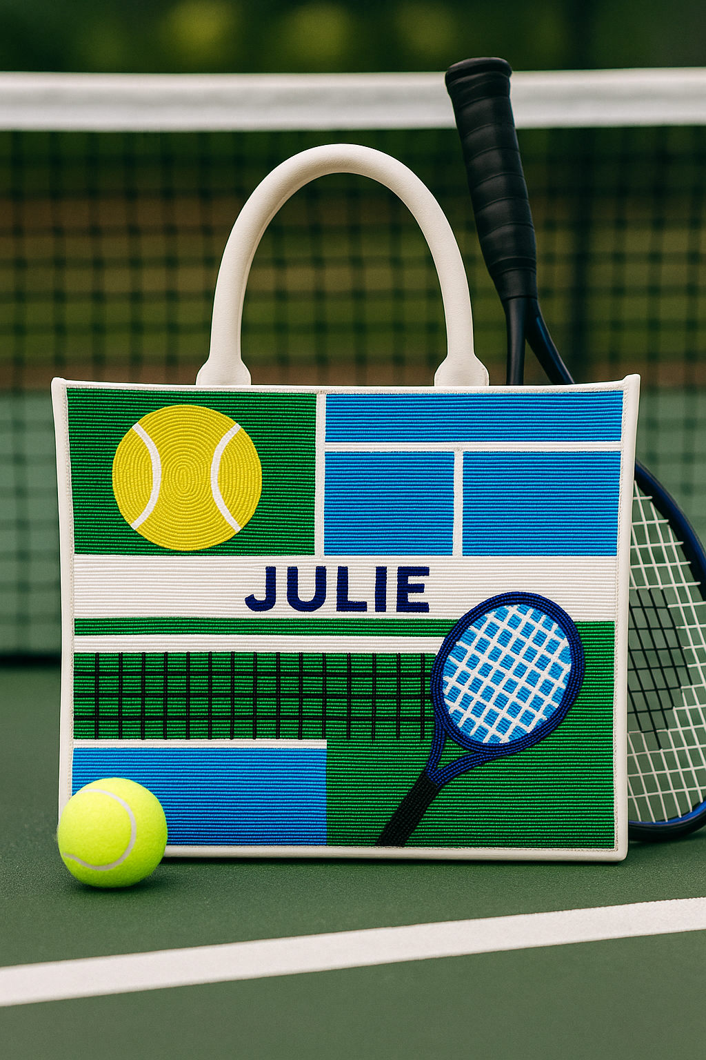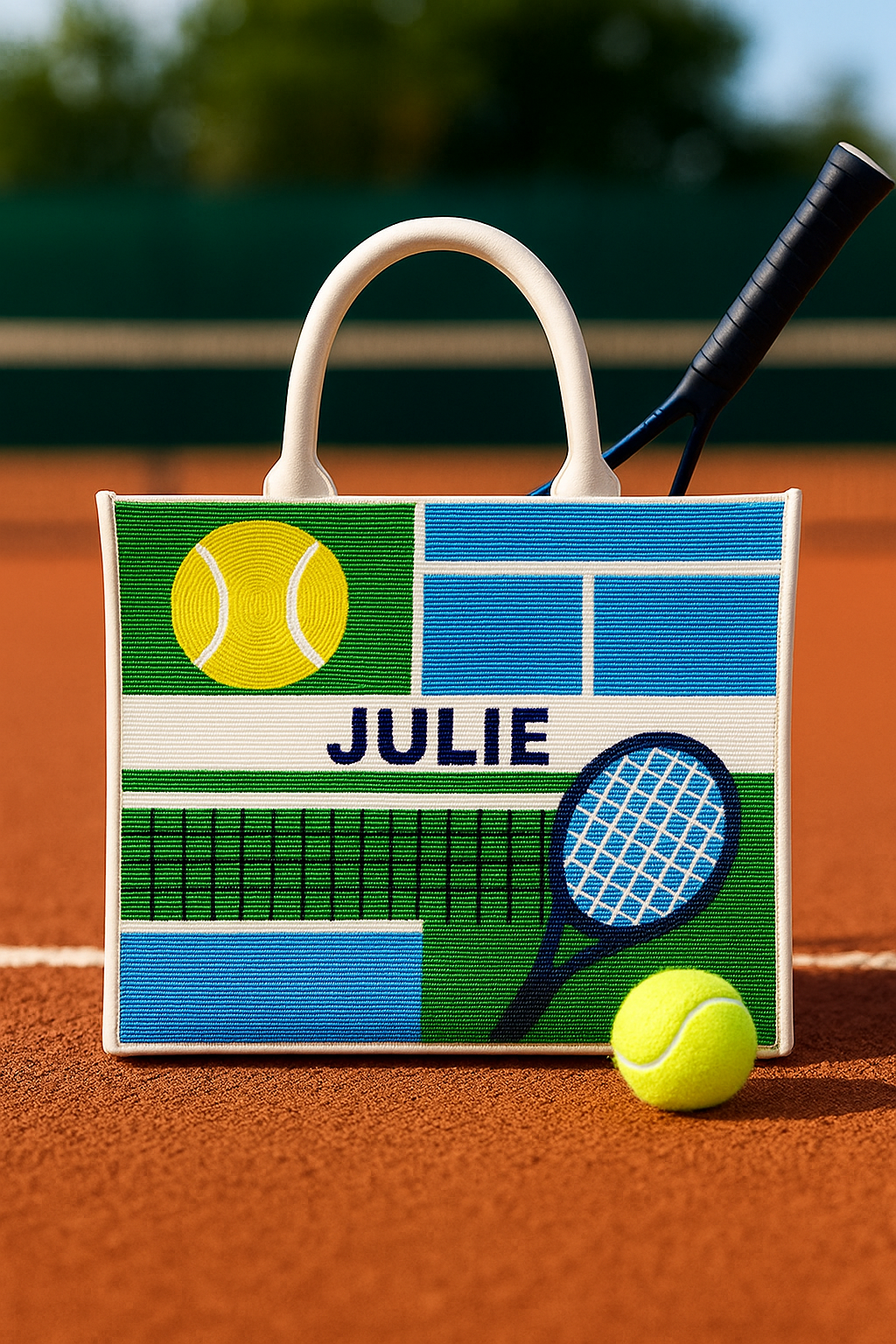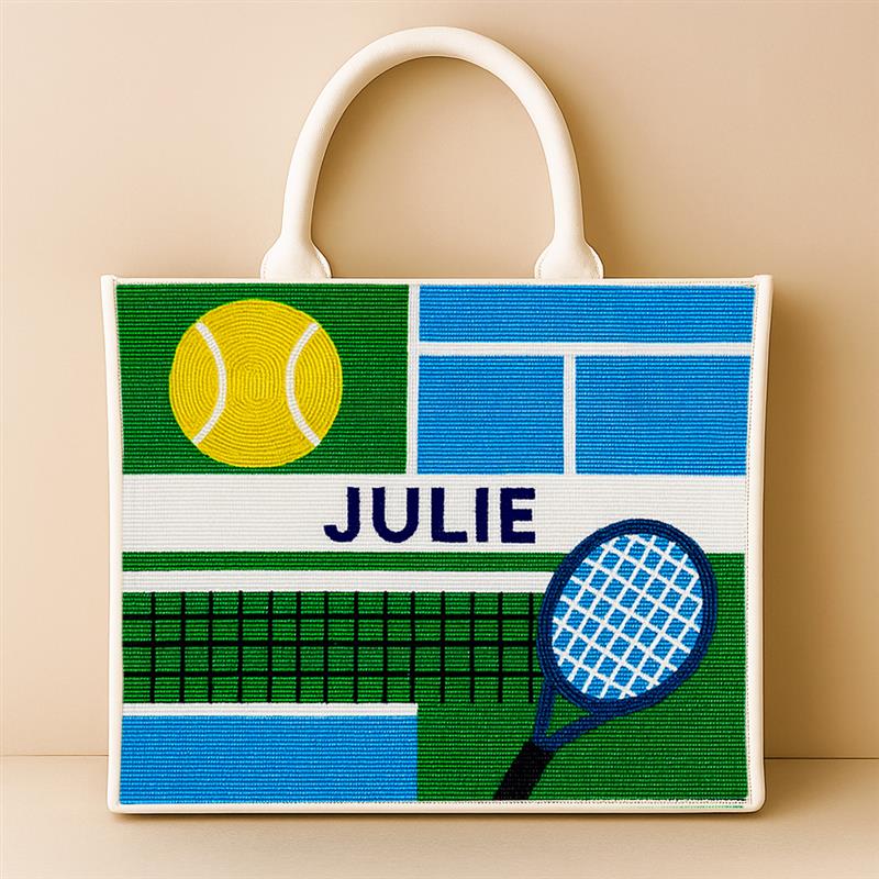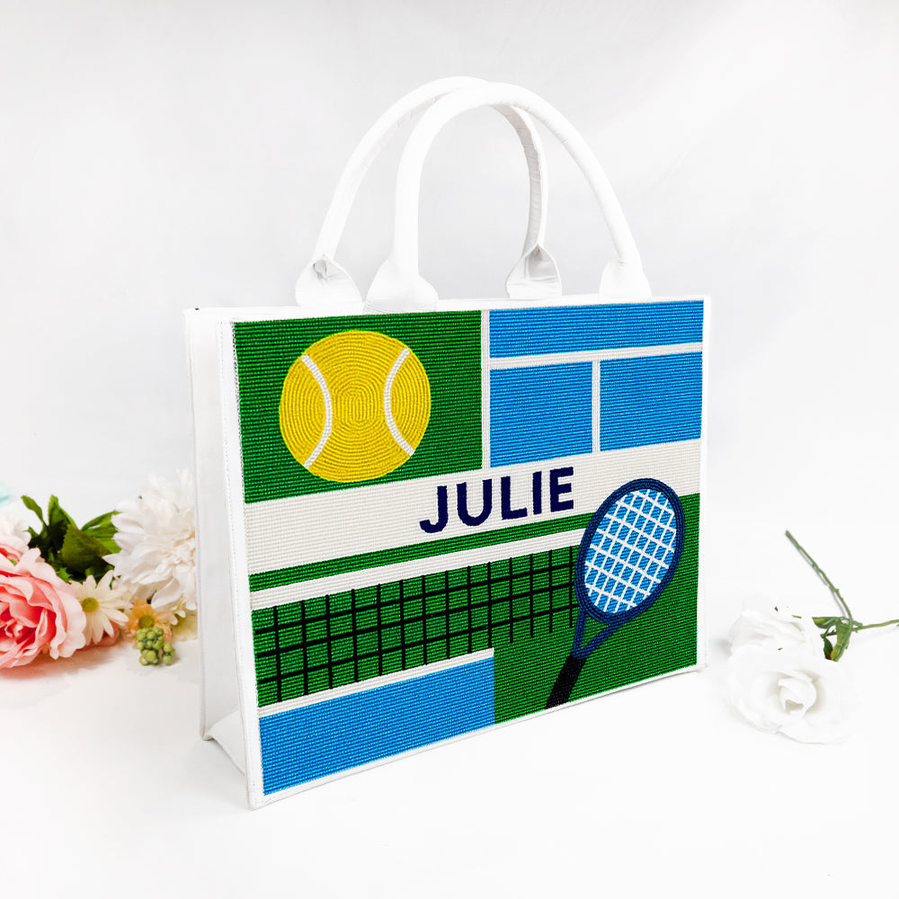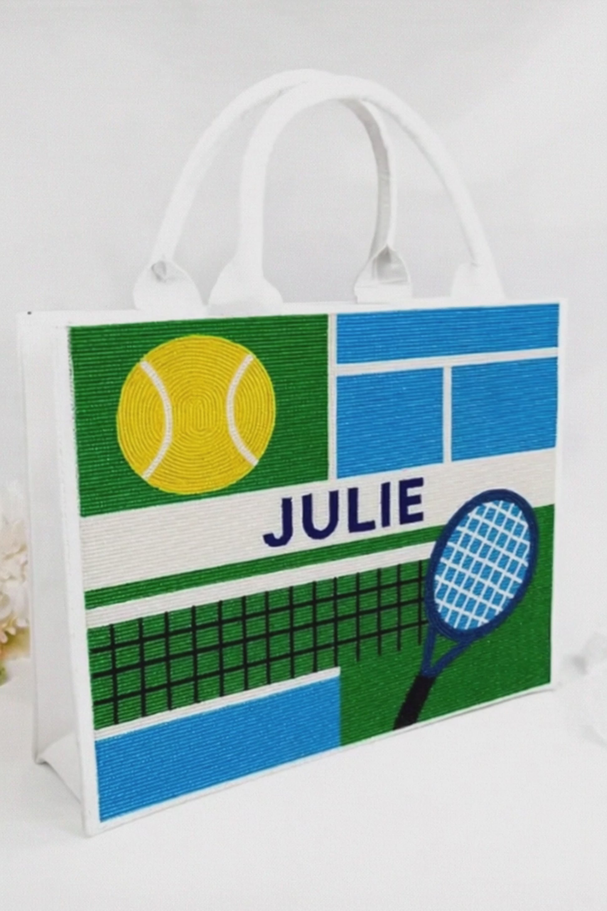 Ace your accessory game with our custom beaded tennis tote — a perfect blend of sporty chic and personalized flair. Featuring a vivid tennis court design complete with racket and ball detailing, this tote makes a standout gift for tennis lovers, bridesmaids, or anyone with Wimbledon dreams. The name “JULIE” is intricately beaded across the front, and the bag's sturdy yet stylish build is ideal for carrying essentials to the court or the café. Whether you're gifting or treating yourself, this tote is a match point in fashion.
