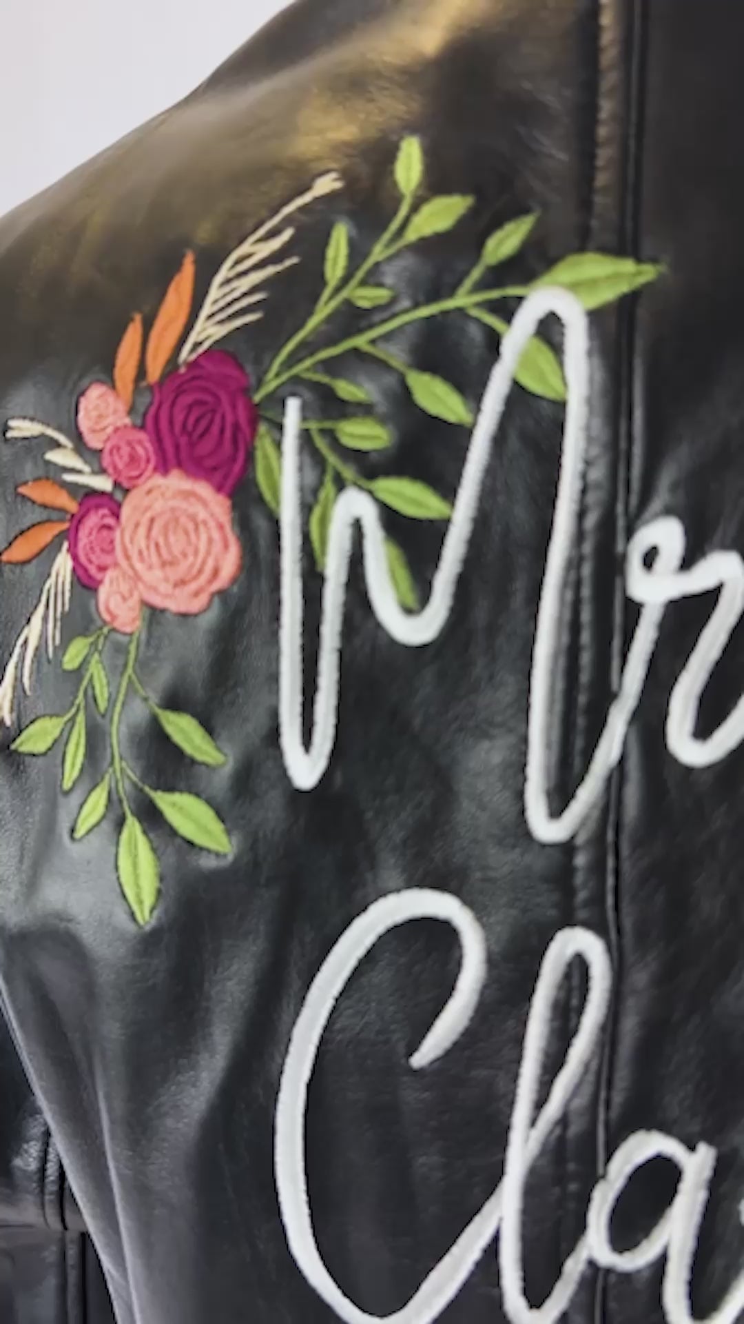Bridal Leather Jackets are such a hit these days! If you're looking for the perfect fall or winter wedding jacket, our custom bridal leather jackets are great! With fully customizable embroidered options such as thread, image, and leather, our customized embroidered jacket is sure to be the wedding jacket of your dreams. Our leather jackets also have fully functional pockets and zippers on the sleeve to expand the arm opening. These also make a great engagement gift or bridal shower gift for a bride-to-be. If you need your bachelorette party accessory, this black leather jacket is sure to help you rock your bach party!