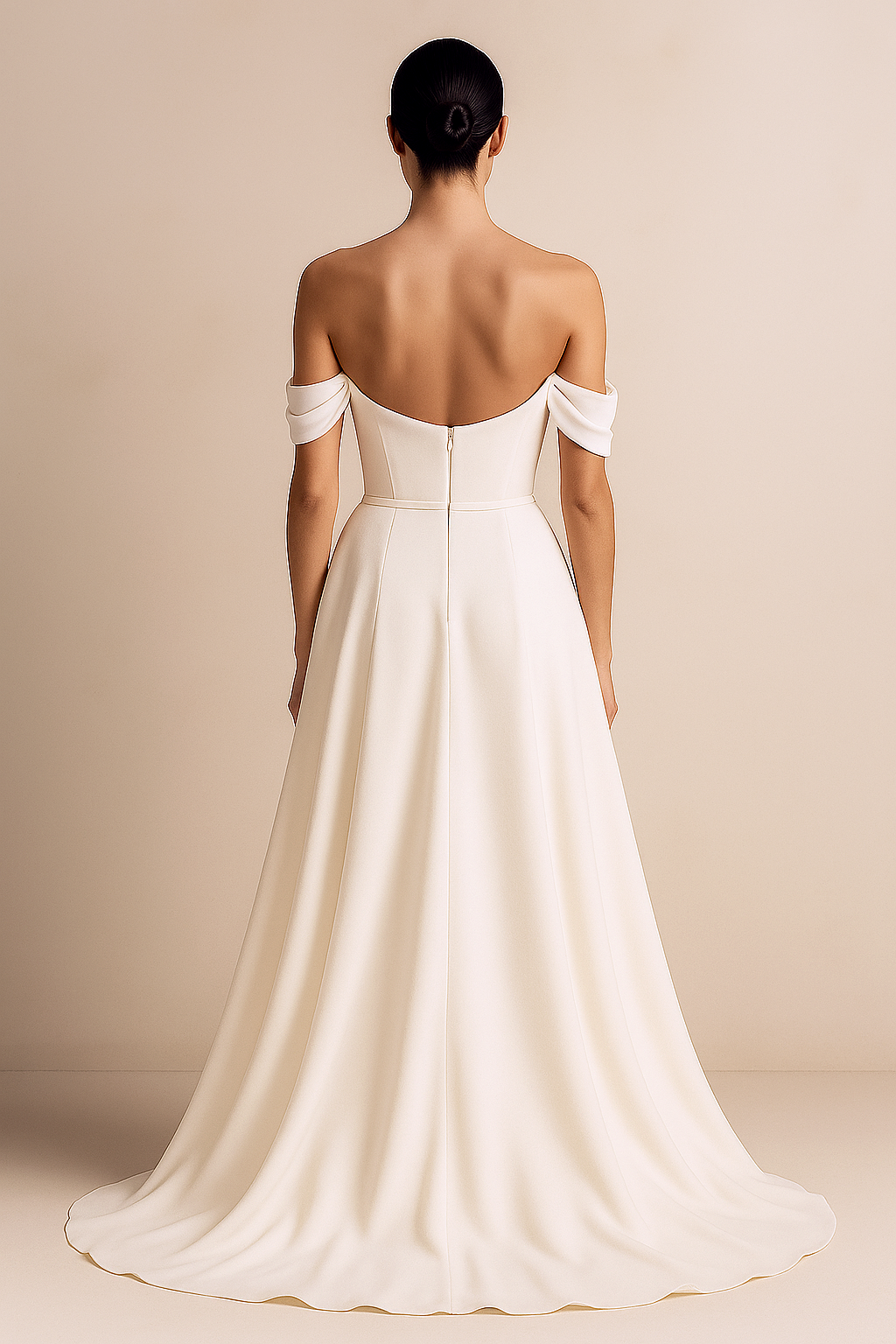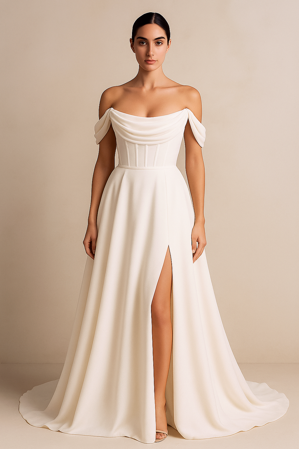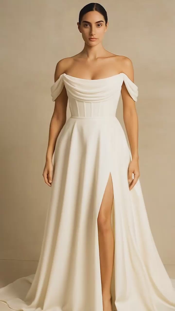 Sophisticated and timeless, this off-shoulder wedding gown is a perfect choice for the modern romantic. Crafted in smooth satin, it features a structured bodice with overlapping draped details that accentuate the neckline and shoulders. The clean A-line silhouette creates a flattering fit through the waist before flowing into a soft, chapel-length train. Designed with elegance in mind, this gown is ideal for grand ceremonies, elegant venues, or any bride who desires a regal, minimalist look that never goes out of style.