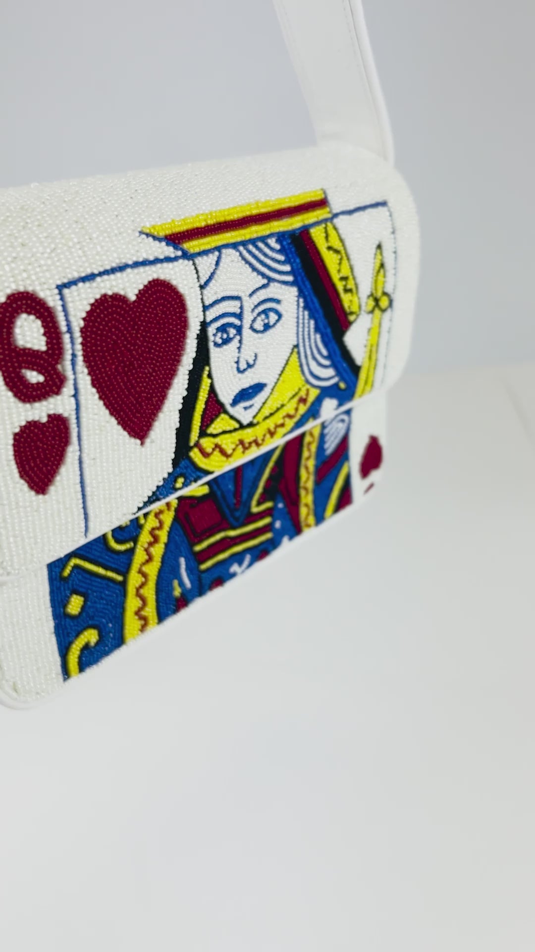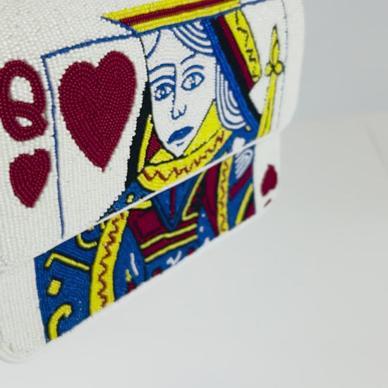 Delicate yet bold, this ivory Queen of Hearts bag features soft blue and yellow tones over creamy white beading. The hand-beaded portrait and card accents create a charming mix of regality and elegance. A dreamy gift for brides, card lovers, or anyone who loves a refined twist on the classic queen motif.