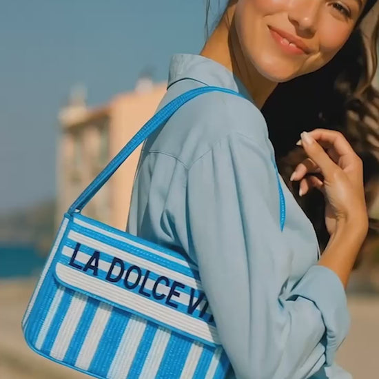 Celebrate “La Dolce Vita” with this hand-beaded striped purse that captures the sweetness of summer living. Featuring bold yellow and white vertical stripes and warm orange beaded lettering, this shoulder bag radiates sun-soaked charm. Designed with a padded canvas strap for easy carrying and crafted for fashion-forward fun, it’s the perfect statement accessory for seaside strolls, brunches, or jet-setting adventures. Let every outfit live a little sweeter.