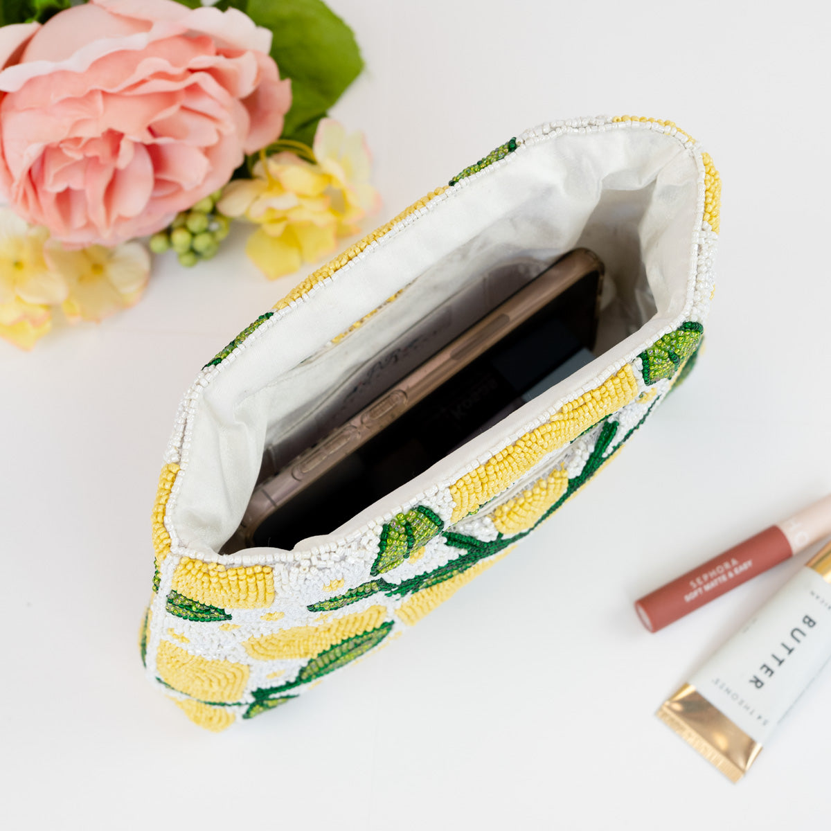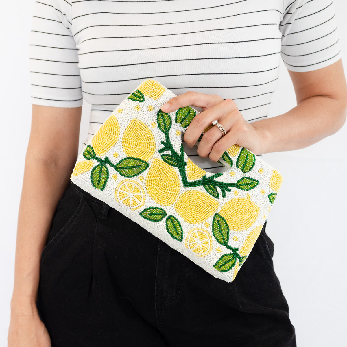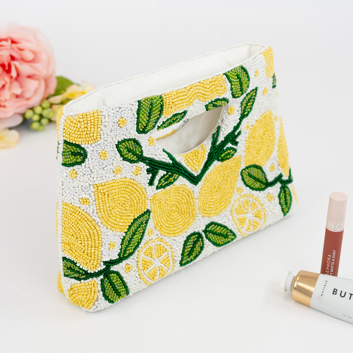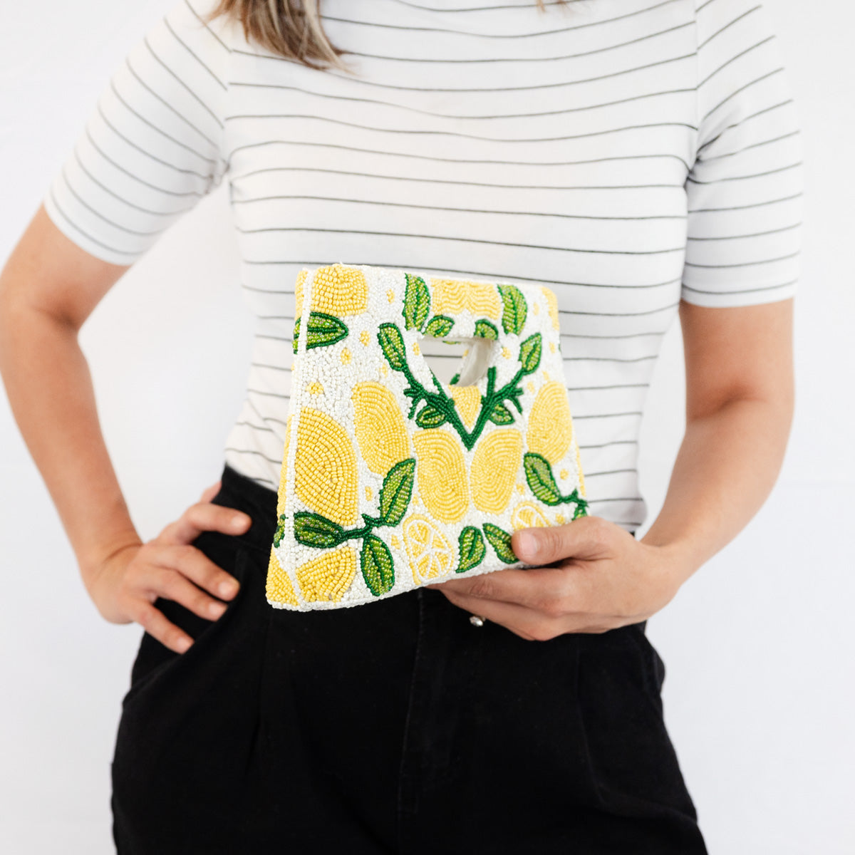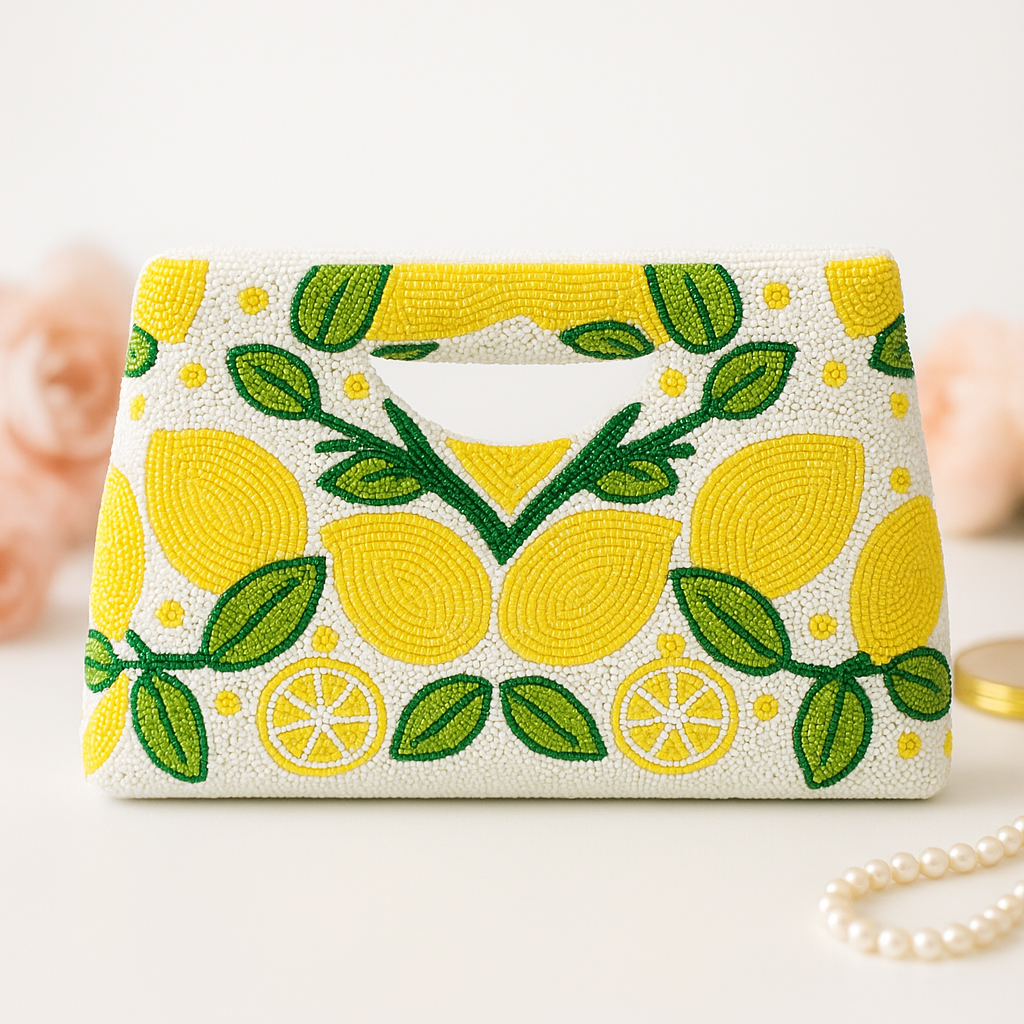 Introducing our Lemon Beaded Handbag – a vibrant accessory that brings a fresh pop of citrus to your look. Handcrafted with meticulous detail, this stylish bag features intricate beadwork, with bright yellow lemons set against a white background. This lemon purse is designed for a playful look perfect for both day and night outings.