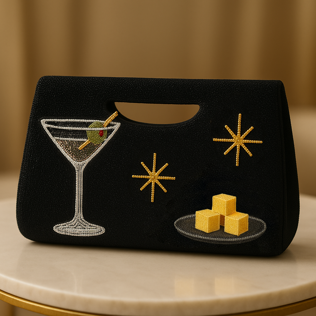 These stunning, Martini-themed beaded clutches are the perfect accessory for any cocktail lover or partygoer. Each one is meticulously handcrafted with intricate beadwork to create a chic, luxury look. Whether you’re attending a glamorous evening event or adding a playful touch to your outfit, these clutches are sure to turn heads. The design features sparkling martini glasses, olives, and even fun details like spilled drinks and cheese cubes for a unique touch.