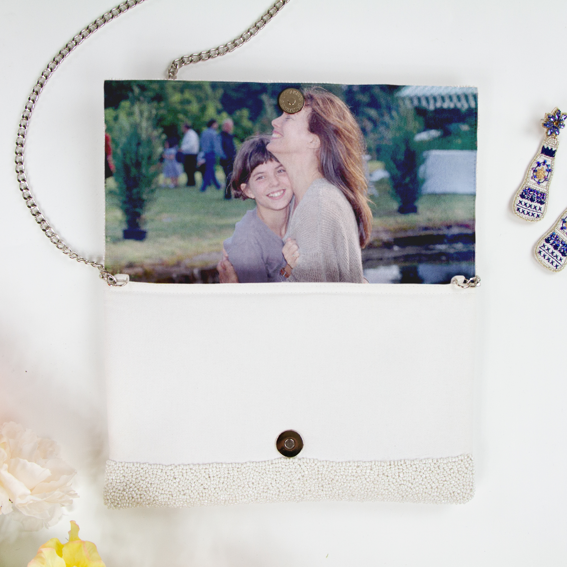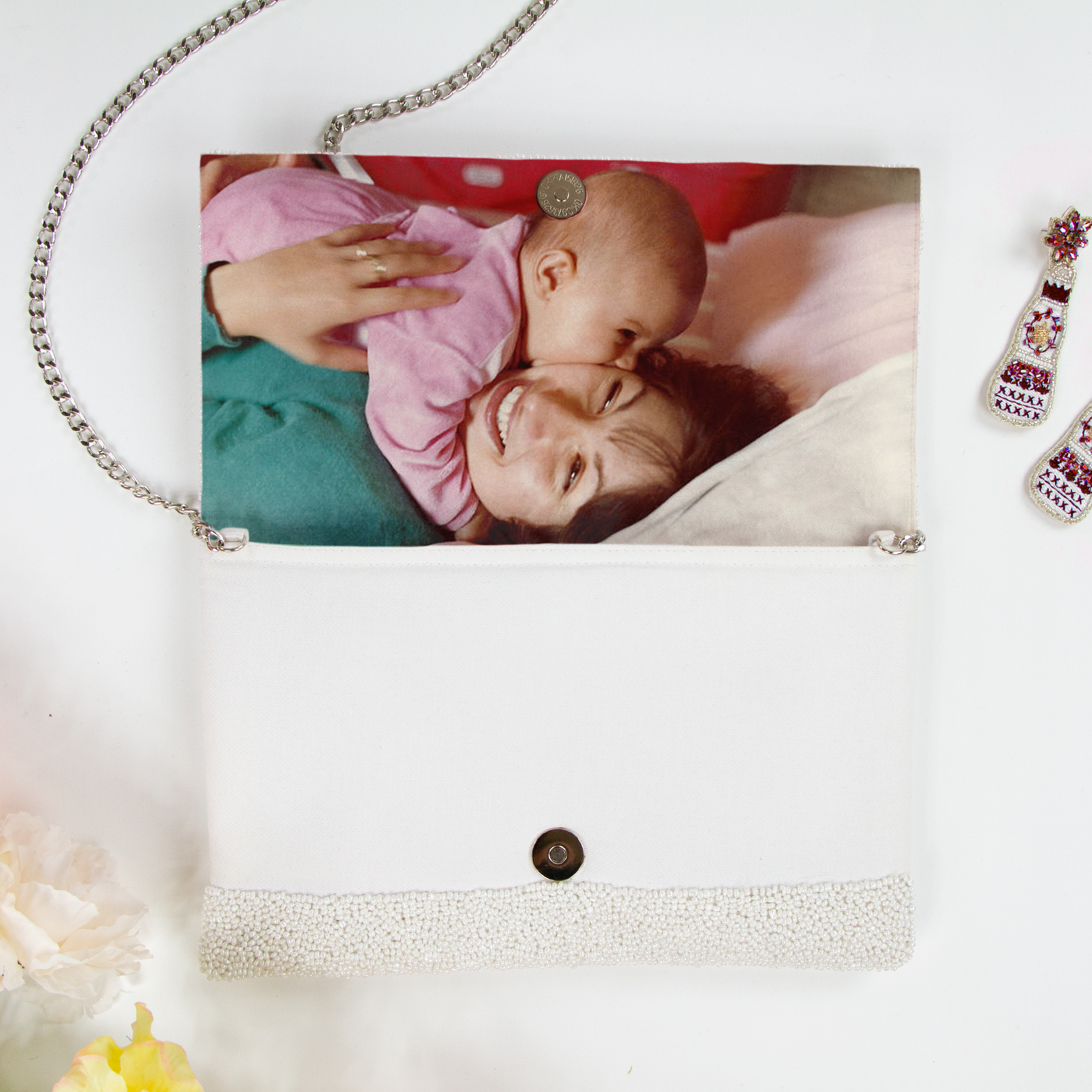 - Upload photos for the inside flap. - Hand Beaded: Each clutch is intricately handmade, making every piece unique.