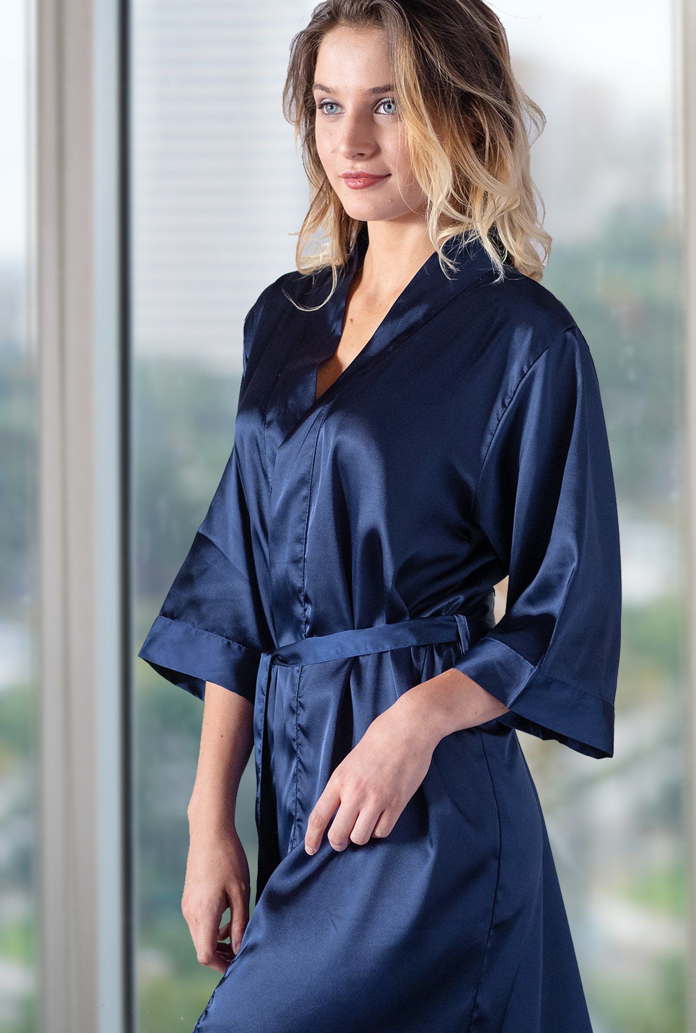 Navy Blue Satin Robe - Kimono Bridal Robes