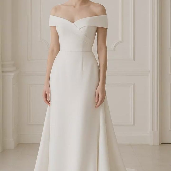 Sophisticated and timeless, this off-shoulder wedding gown is a perfect choice for the modern romantic. Crafted in smooth satin, it features a structured bodice with overlapping draped details that accentuate the neckline and shoulders. The clean A-line silhouette creates a flattering fit through the waist before flowing into a soft, chapel-length train. Designed with elegance in mind, this gown is ideal for grand ceremonies, elegant venues, or any bride who desires a regal, minimalist look that never goes out of style.
