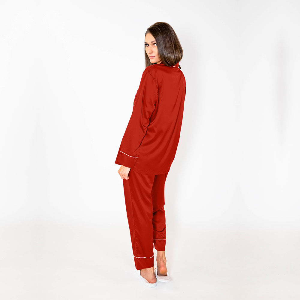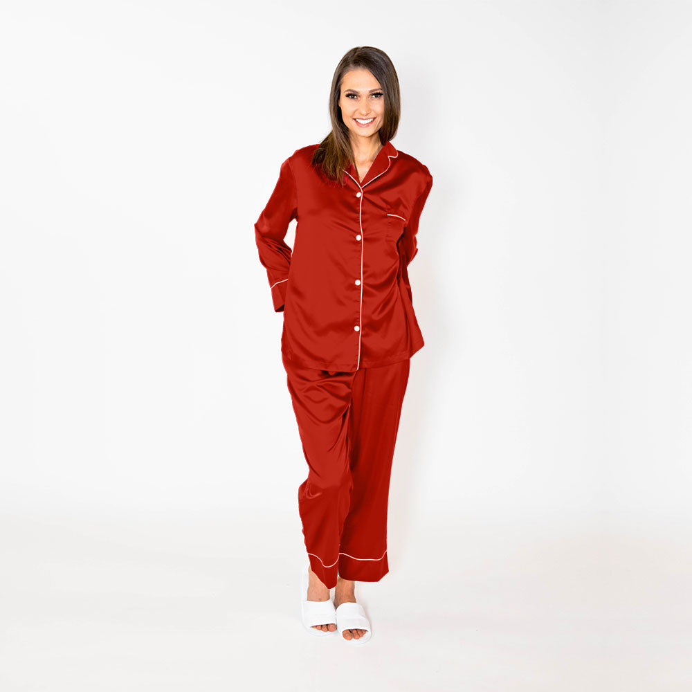 Our 2 piece Matte Satin Pajama Set is the perfect wedding day alternative to robes you've been searching for. Our bridesmaid pjs are made from breathable lightweight matte satin give your pjs a mute and more elegant look and feel - one that your bridesmaids will absolutely love. Our pjs are a gift you bridesmaids will appreciate long after the wedding. The pajama fabric color is contrasted by piping which adds a decadent touch to the pjs.