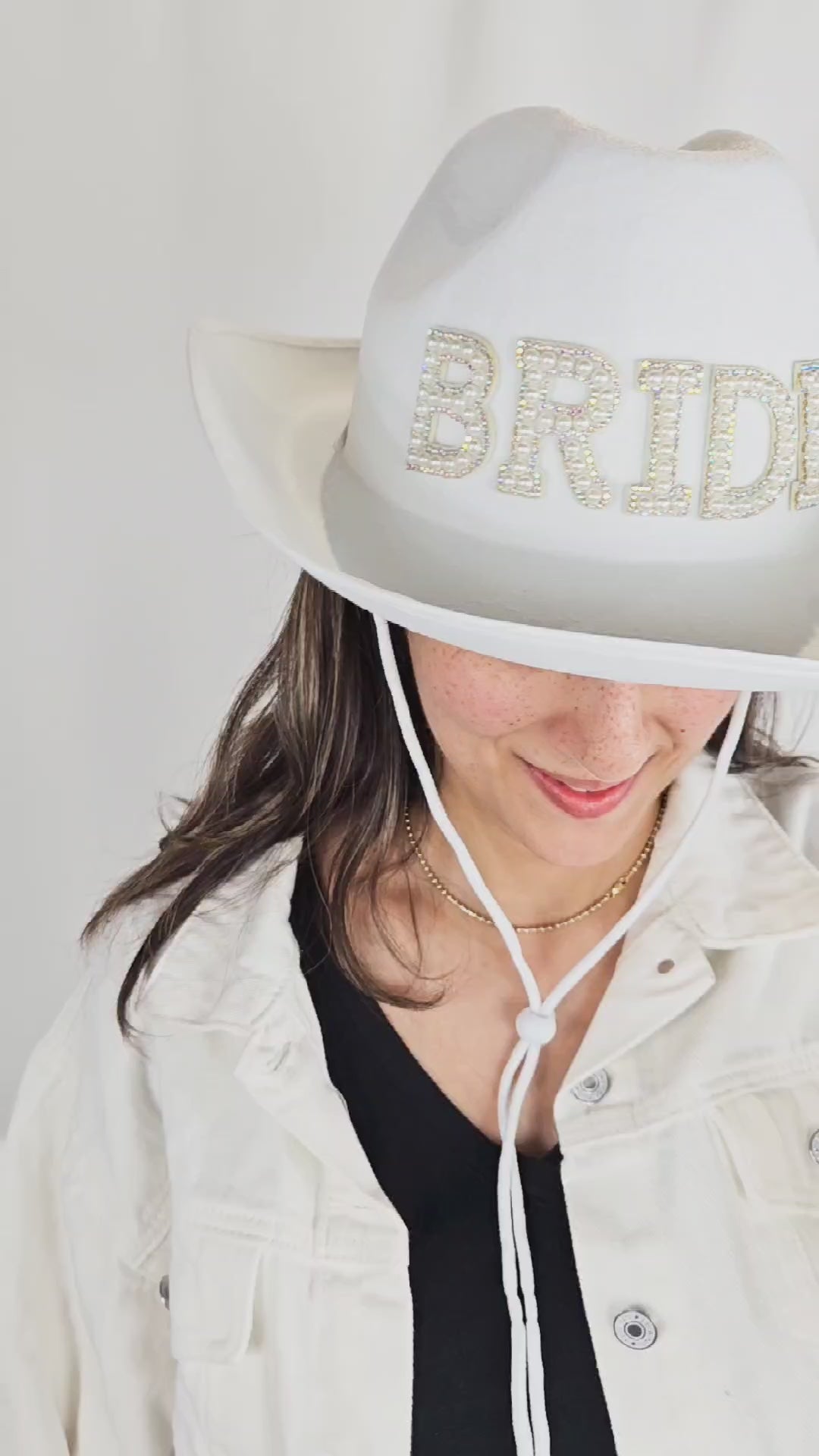 These bride cowboy hats add class, style, and a touch of fun to your bachelorette party, bridal shower, or even your wedding day! Our bride cowgirl hats are perfect for a country western bachelorette party or Nashville bachelorette party. With three styles including one decorated with a row of rhinestone mesh and pearl bride patches, a plain bride cowboy hat, or a trendy paper mesh Bride cowgirl hat, our cowgirl party hats will give a touch of sparkle and sass and help you stand out from the crowd. Top your look off with our pearl bride bachelorette party hat!