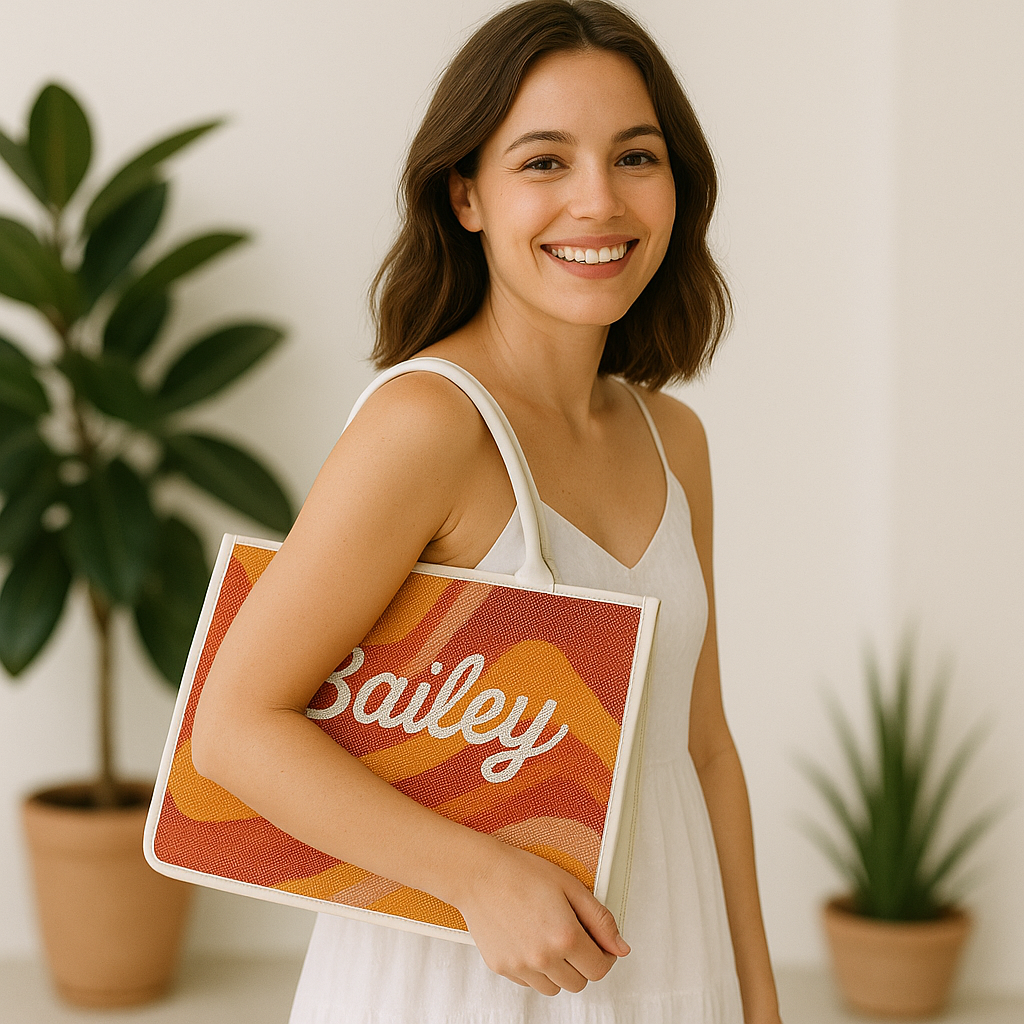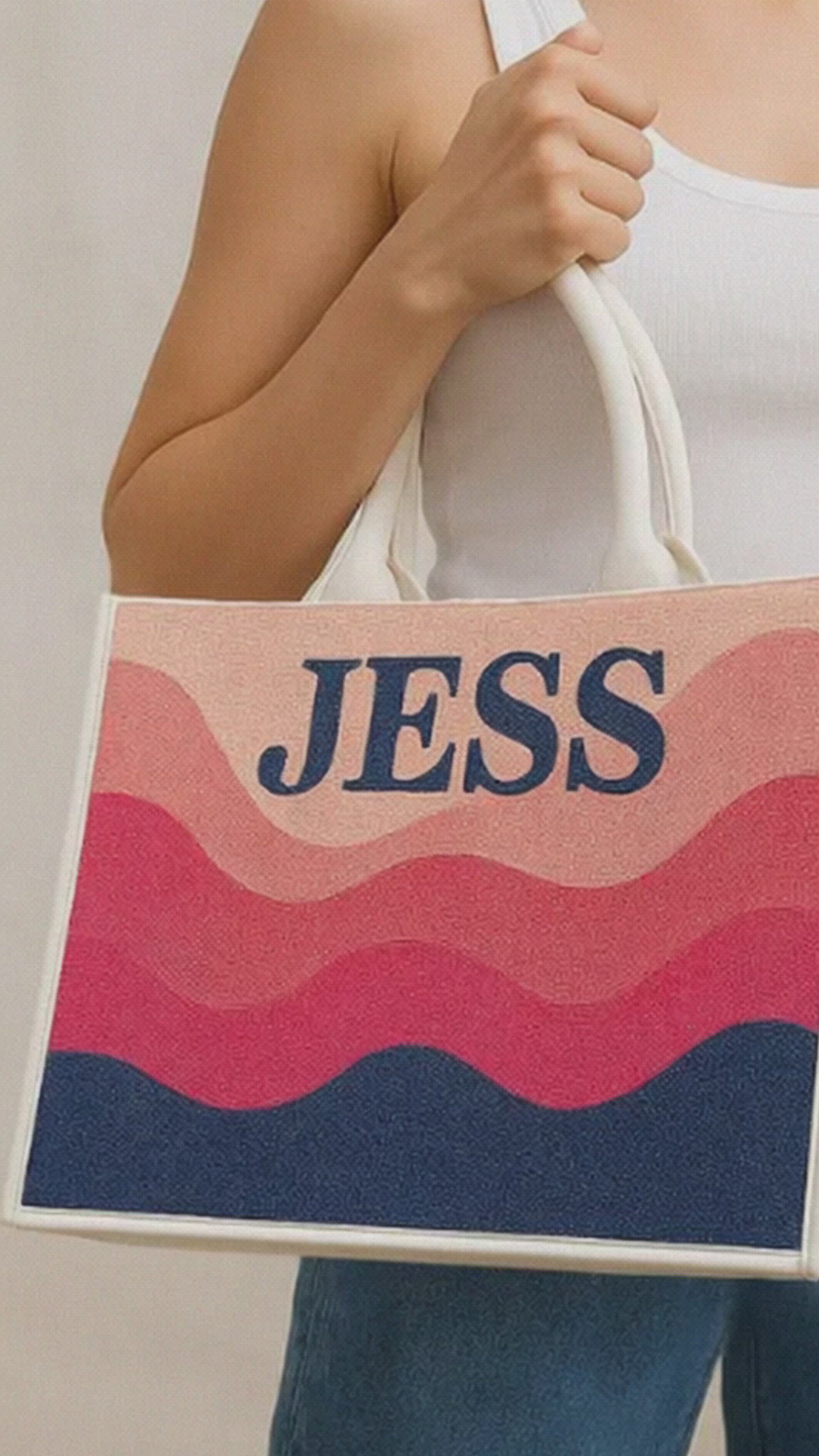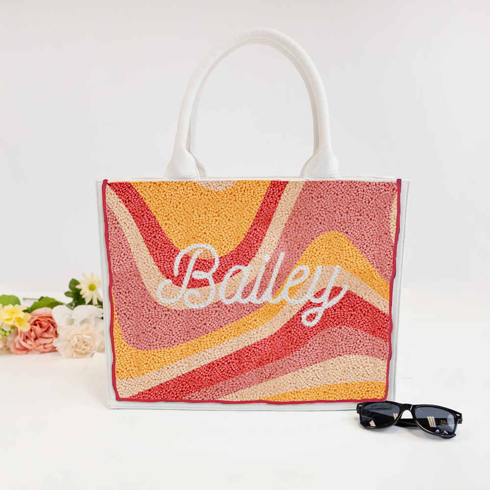 Looking for a gift for her? Look no further! This fully custom tote bag is the perfect gift for a bride, bridesmaid, mother, sister, or friend. Personalize this beaded tote with their favorite pattern, colors, and their name! Or get one for yourself! Our beaded canvas tote works great as a beach tote bag or a honeymoon travel tote. These tote bags are quality made with an inner satin lining, inside zipper pocket, along with two open pockets and a magnetic snap closure to keep your belongings organized and secure.
