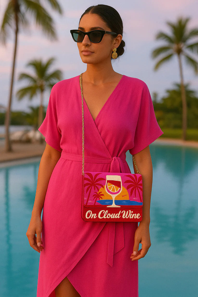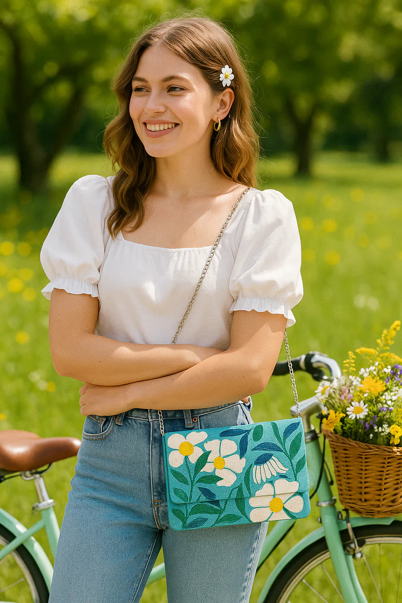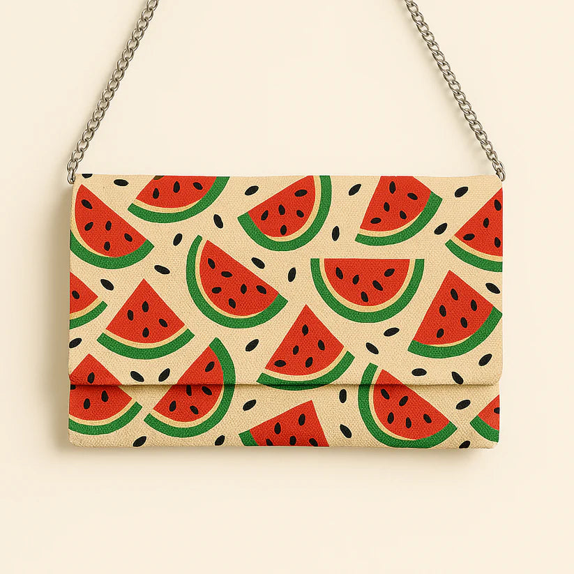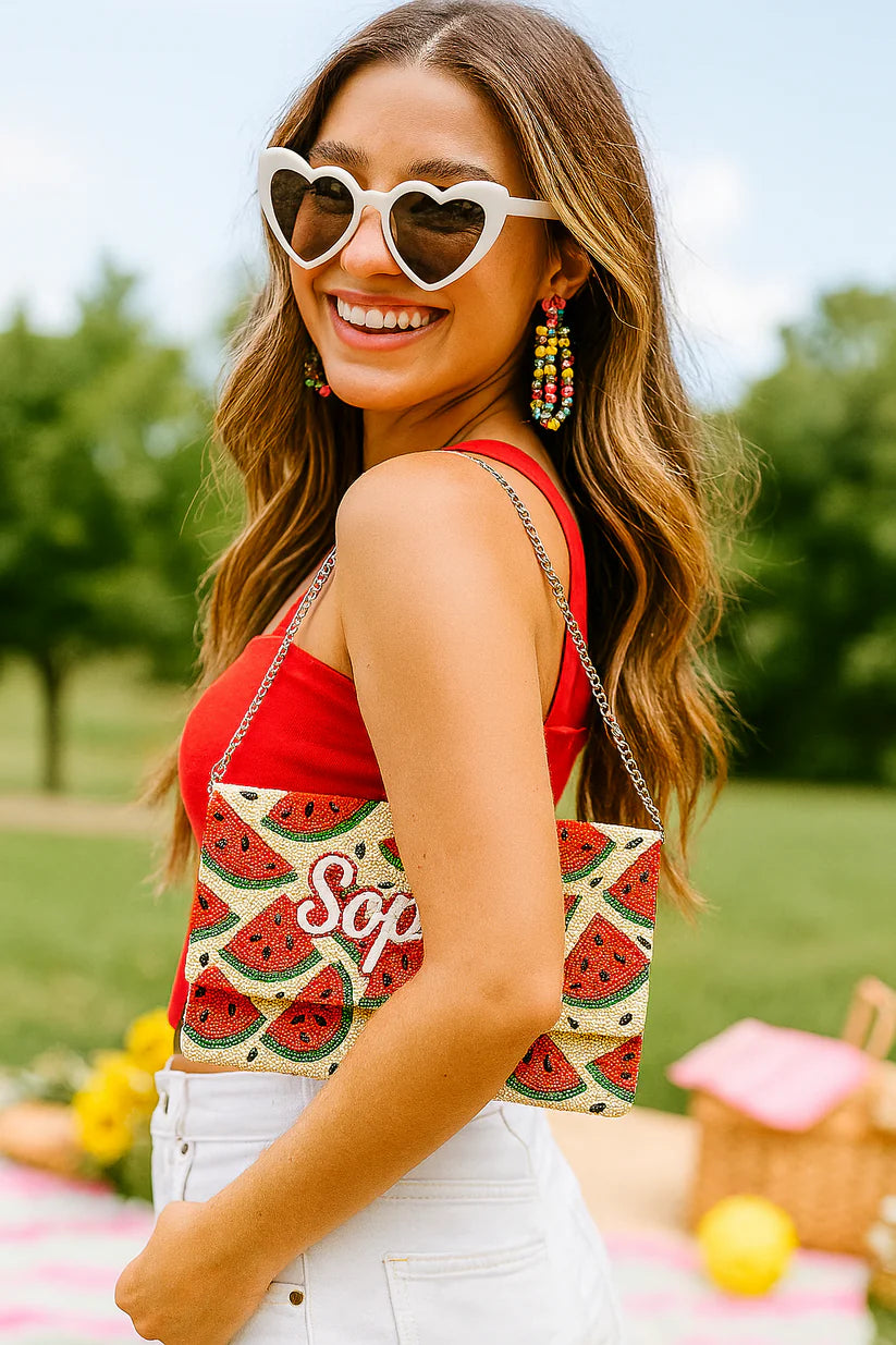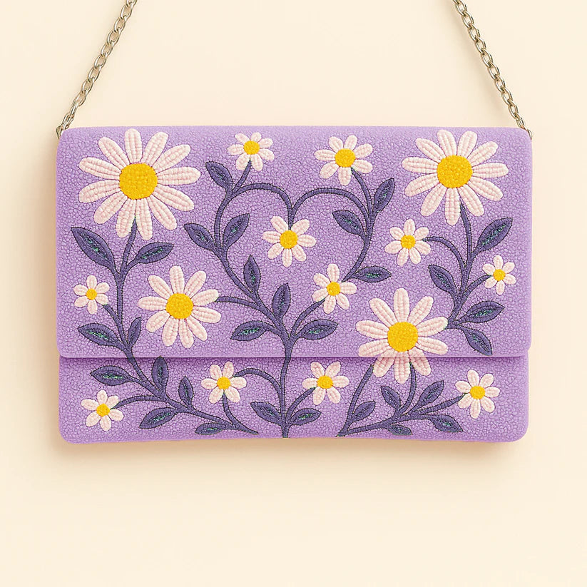 Finished with a sleek silver chain strap, this clutch is the perfect balance of whimsy and sophistication—ready to brighten your day and your outfit.