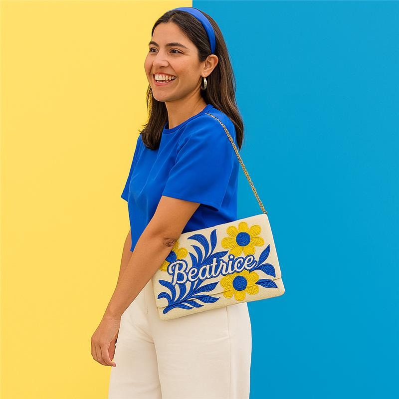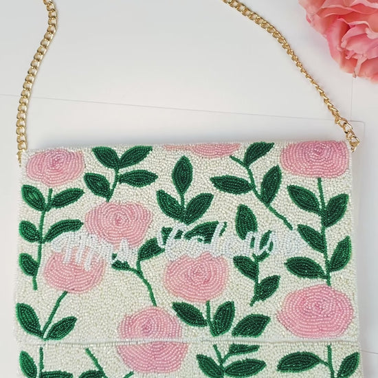 This customizable floral beaded clutch features soft greenery and pink blooms, embroidered with any name of your choice in a delicate script. A perfect accessory for bridesmaids, brides, or anyone looking for a romantic, one-of-a-kind gift.