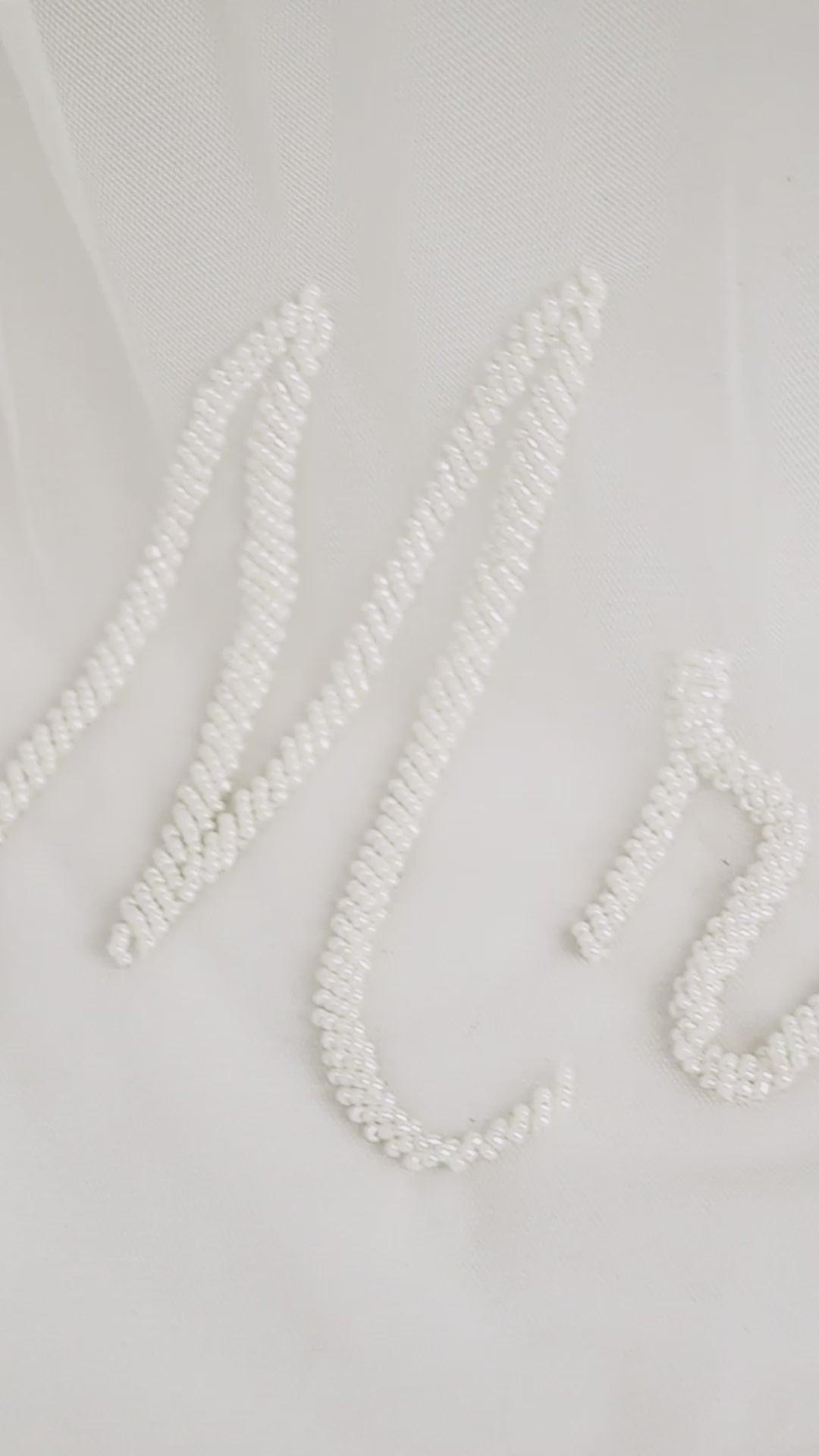 This personalized bridal veil features delicate pearl floral details scattered throughout soft tulle for a timeless yet modern bridal look. Designed for brides who love understated elegance, this veil adds subtle texture and romance without overpowering your gown. Each veil can be customized with your new last name or special wording, making it a meaningful keepsake you’ll cherish long after your wedding day.