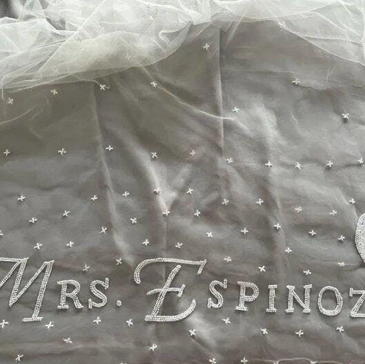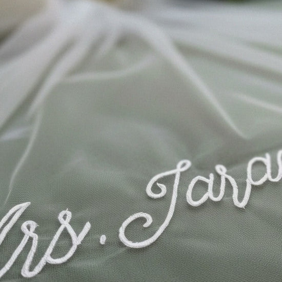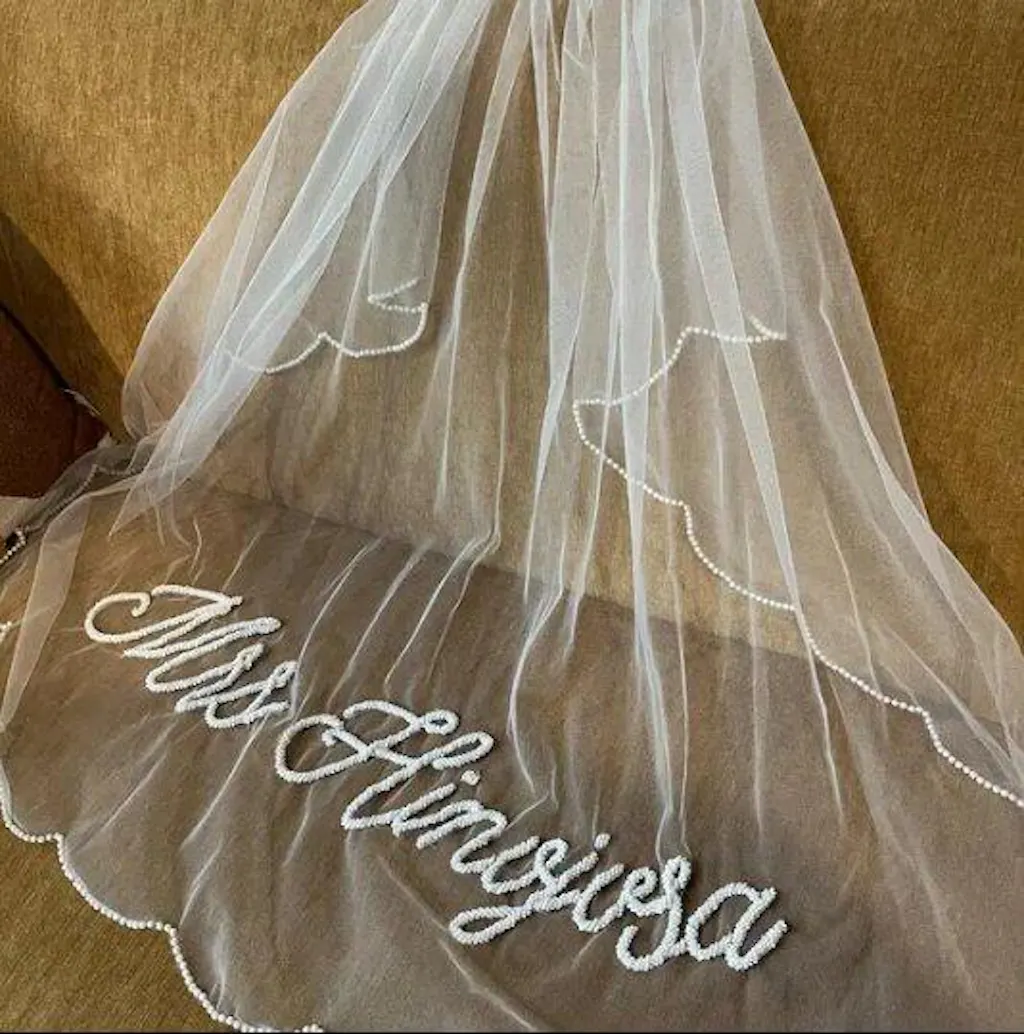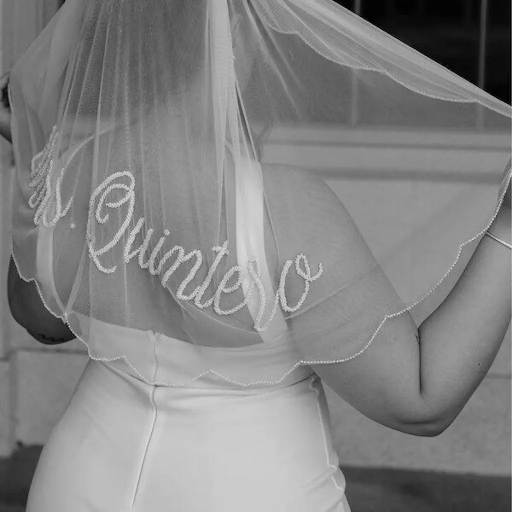 This personalized wedding veil is a timeless statement piece designed to add a meaningful touch to your bridal look. Featuring delicate embroidery customized with your name or special wording, this veil blends classic elegance with modern simplicity. Perfect for brides who love clean lines and romantic details, it’s a beautiful keepsake you’ll cherish long after your wedding day.