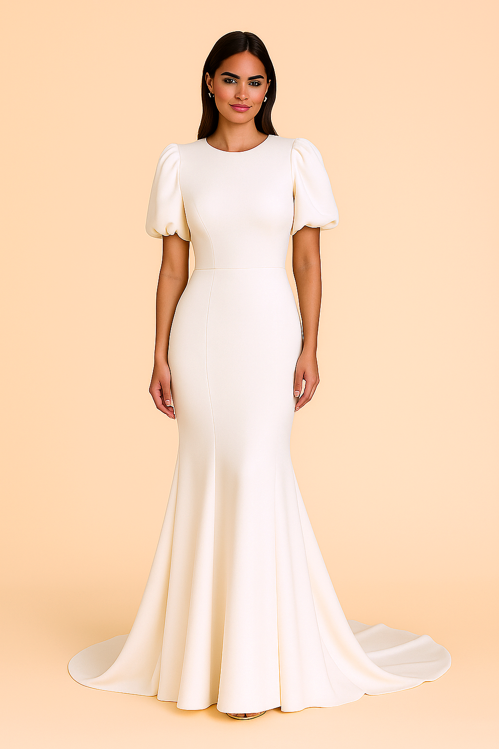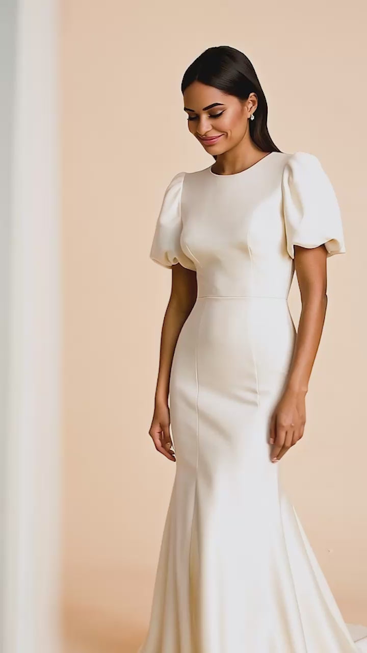 This elegant puff sleeve wedding dress features a high-neck design and a flattering fitted silhouette. The flared skirt enhances the overall sophisticated look, making it a perfect choice for brides seeking a timeless and chic wedding dress.