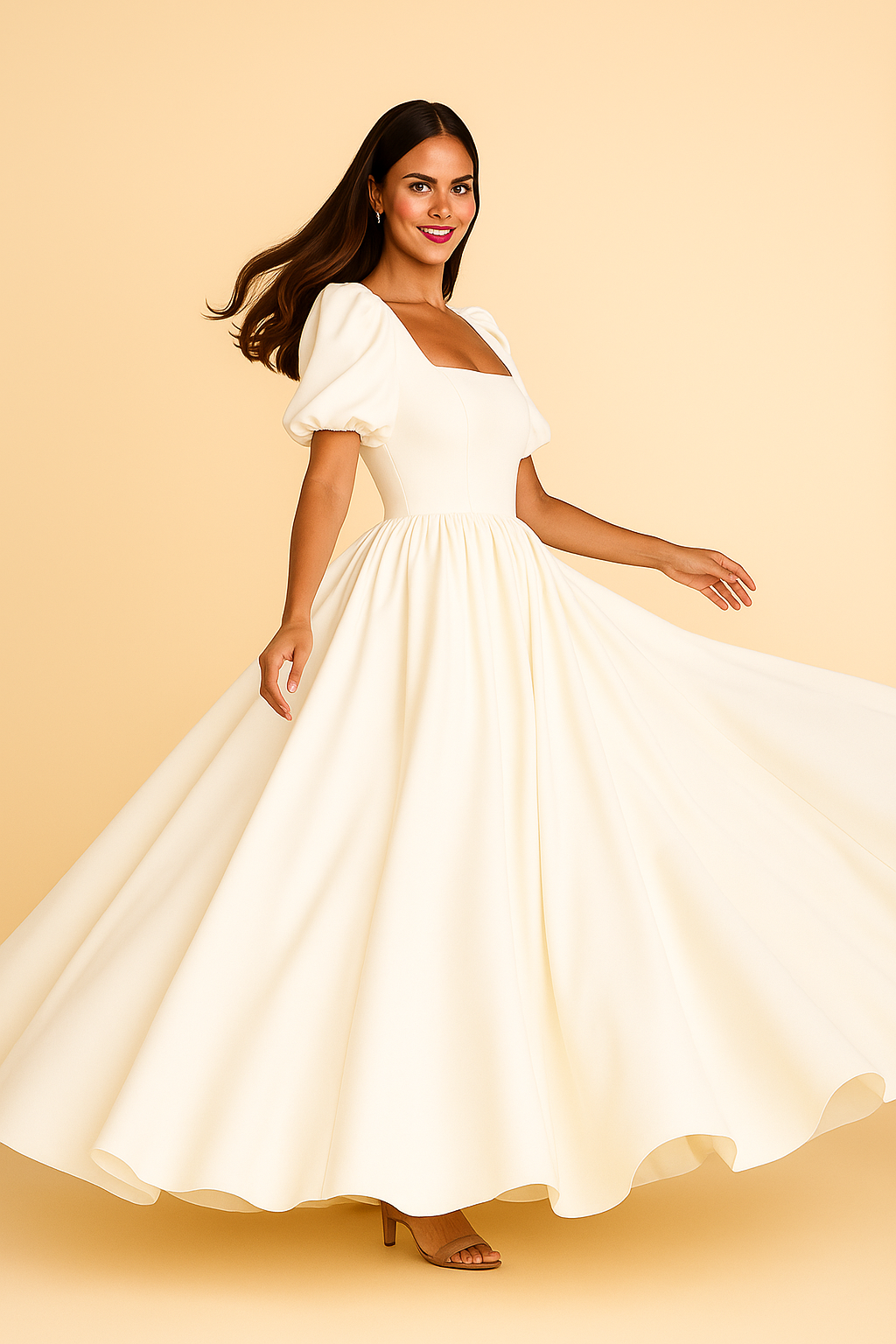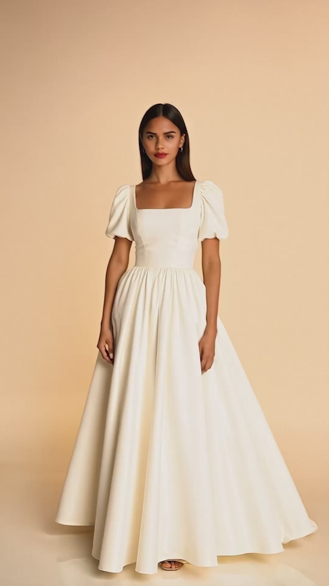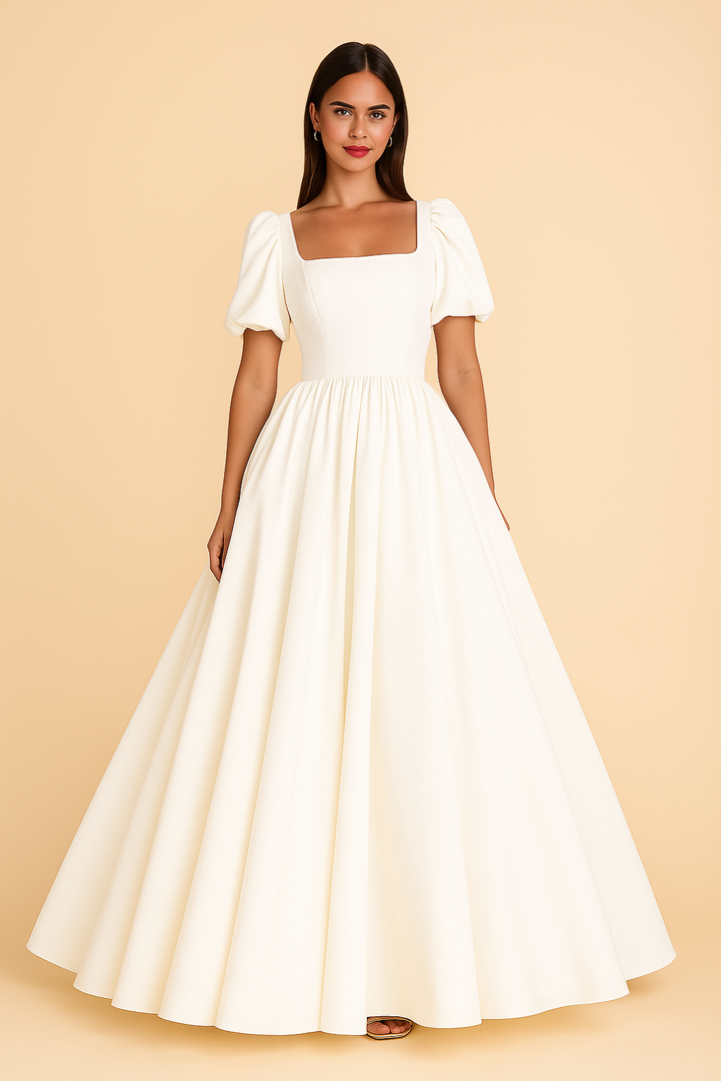 This stunning wedding gown combines classic elegance with a contemporary twist. Featuring a square neckline and puffed sleeves, it captures the essence of vintage romance while offering modern sophistication. The dress is designed with a flattering fitted bodice that flows into a voluminous A-line ballgown skirt, creating a graceful silhouette. The back is equally enchanting, with a simple, elegant closure that adds a refined touch. Perfect for brides seeking a timeless yet modern look, this gown radiates effortless beauty and grace.