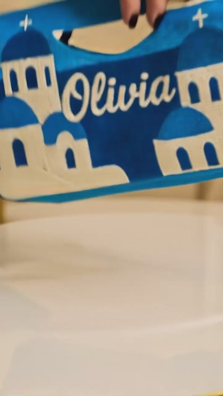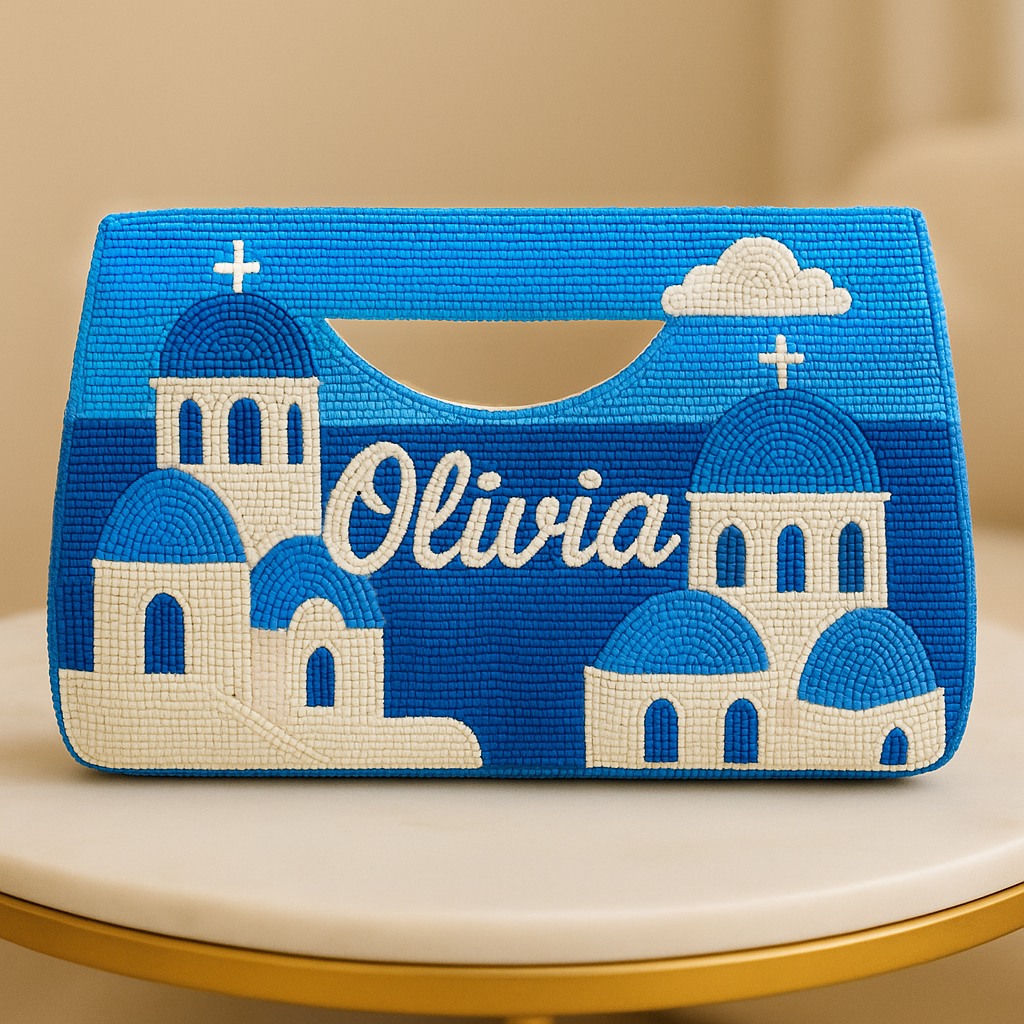 Escape to the white-washed buildings and deep blue waters of Santorini with this striking beaded handbag. Featuring scenic architecture and your custom name, this bag is perfect for the travel lover, beachgoer, or destination wedding guest. Every bead is hand-placed for a stunning finish that brings a touch of the Mediterranean to your everyday style or vacation outfit.