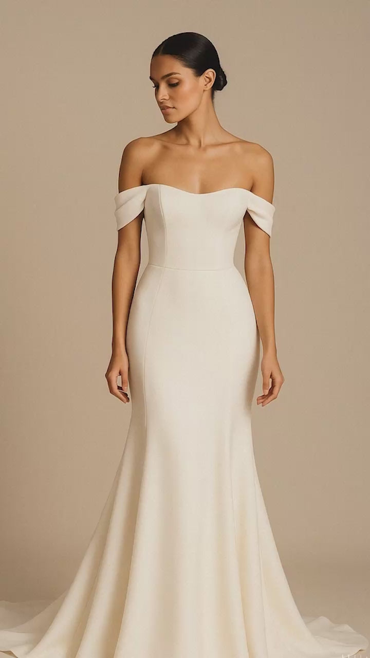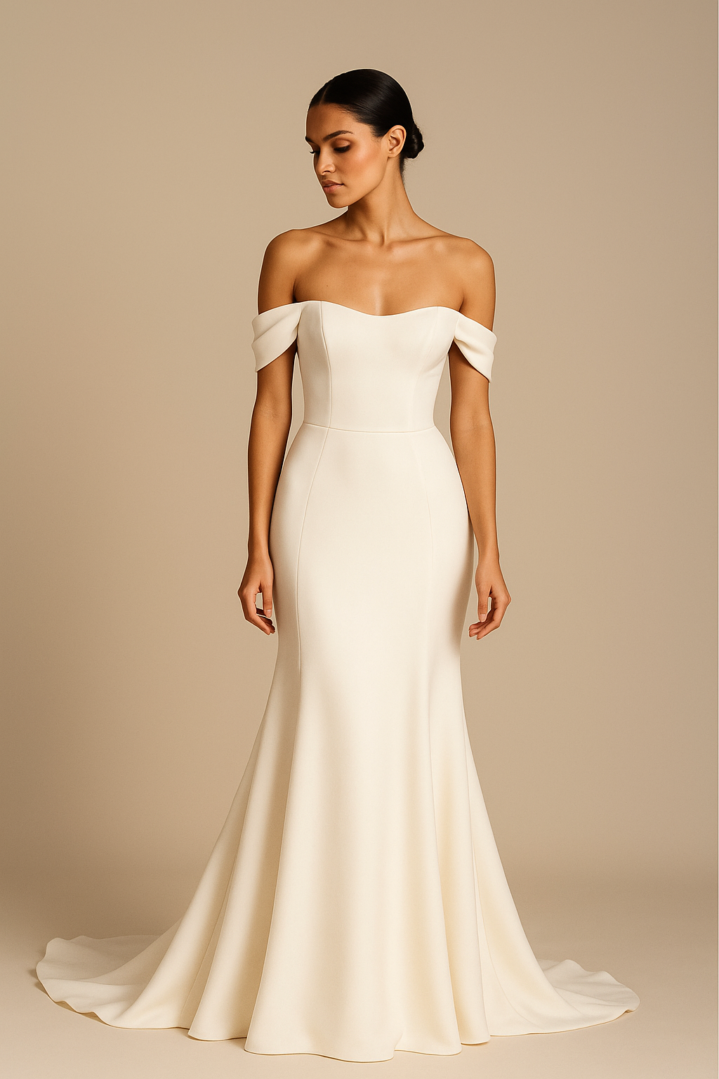 This Soft Sweetheart Off-the-Shoulder Wedding Dress exudes timeless elegance with its flattering sweetheart neckline and romantic off-the-shoulder sleeves. The gown features a tailored fit that gracefully flares into a floor-length skirt, creating a classic silhouette. Perfect for a modern bride seeking sophistication and style, this dress combines simplicity with refined beauty for your special day.