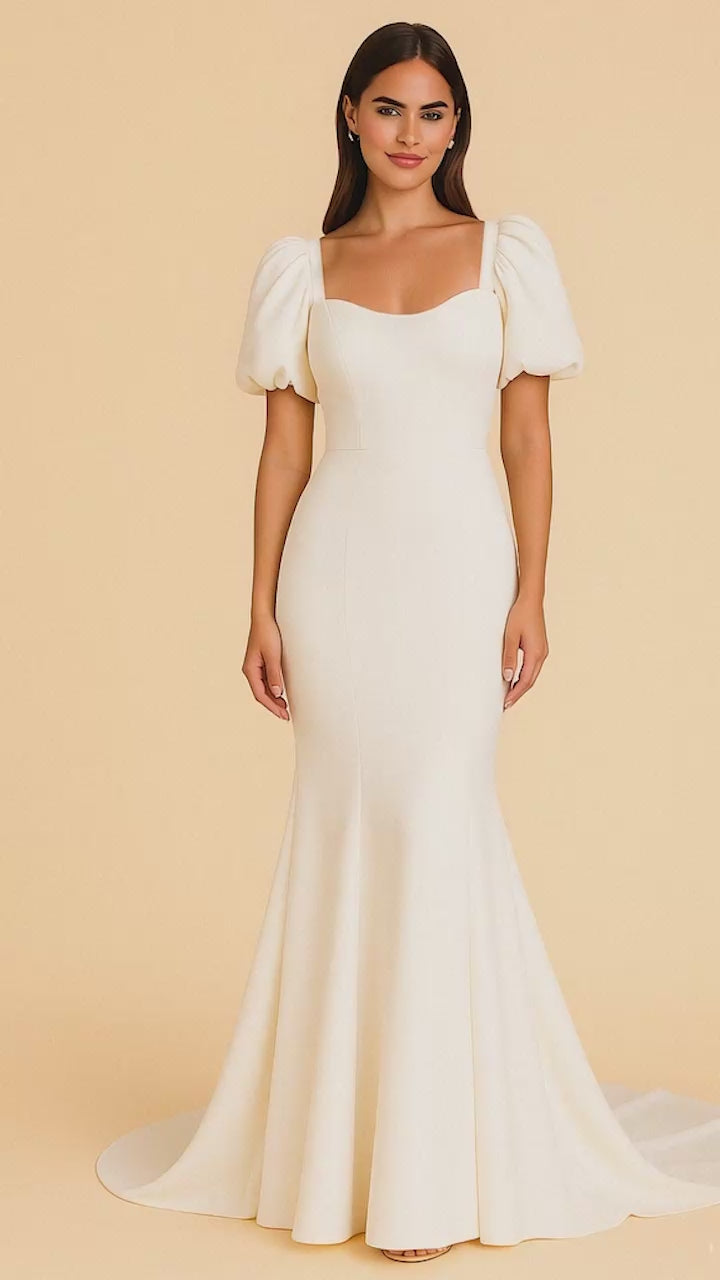 Featuring a modern square neckline and soft puff sleeves, this elegant wedding dress has a flattering fit-and-flare design that gracefully flows into a beautiful skirt. Perfect for brides looking for a sophisticated yet timeless look.