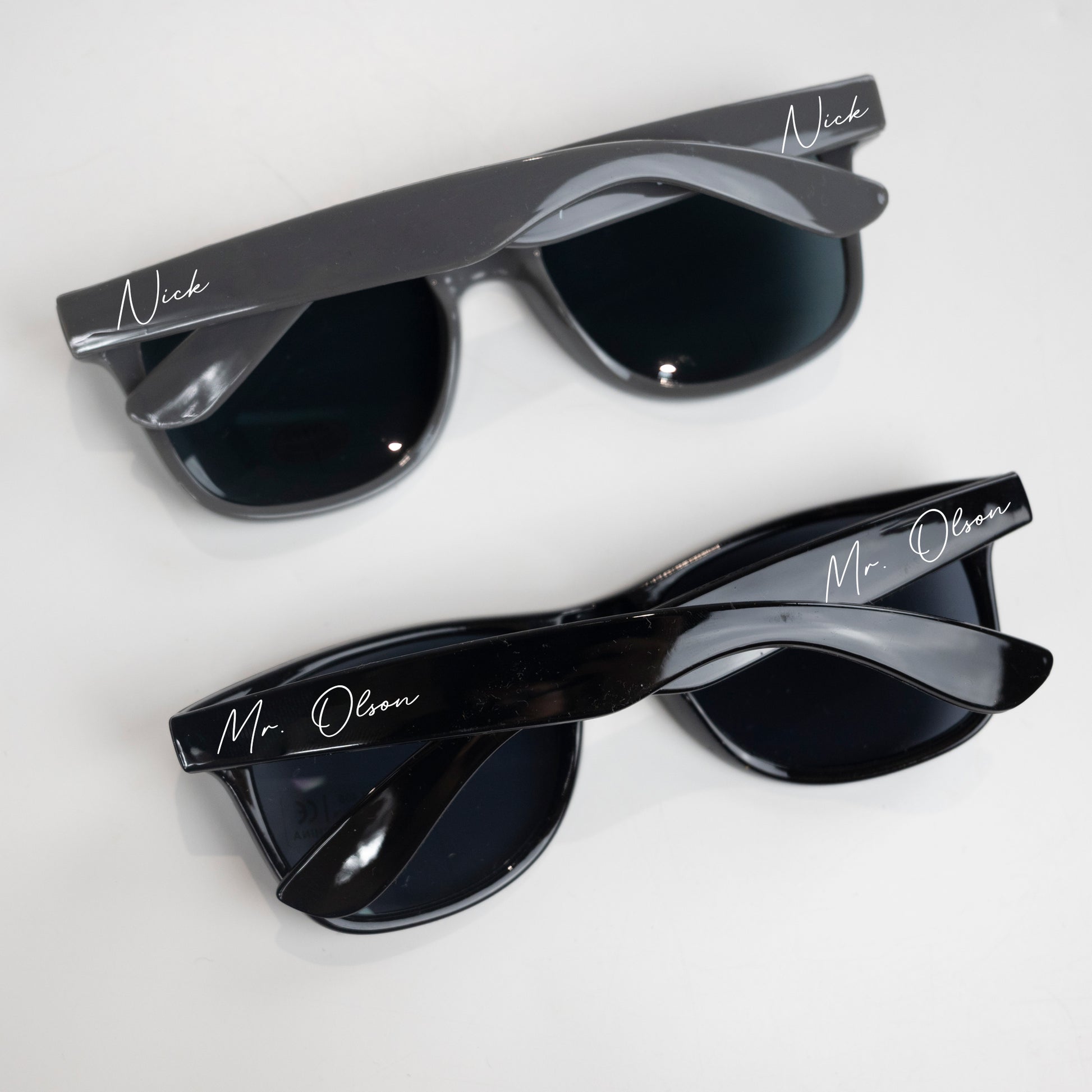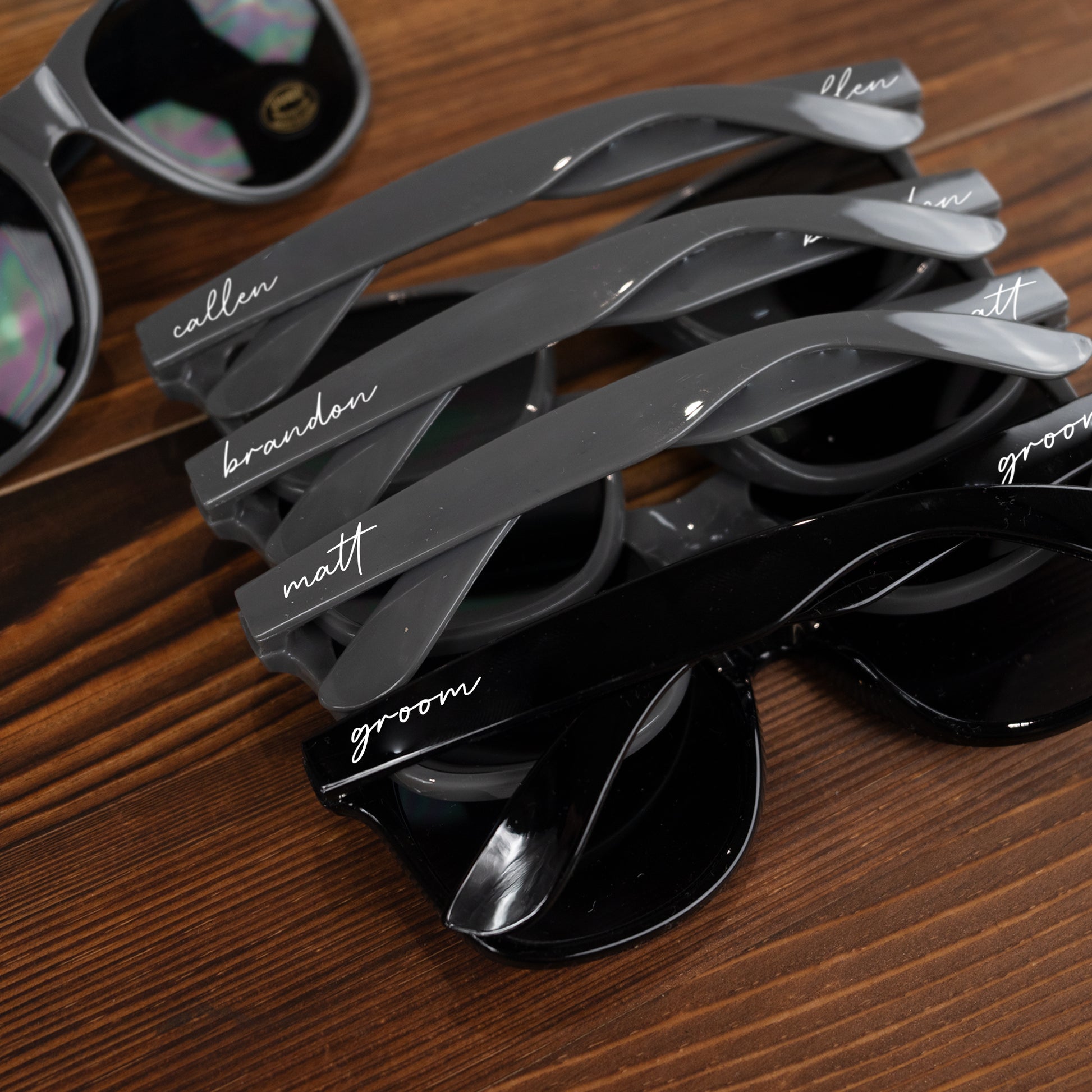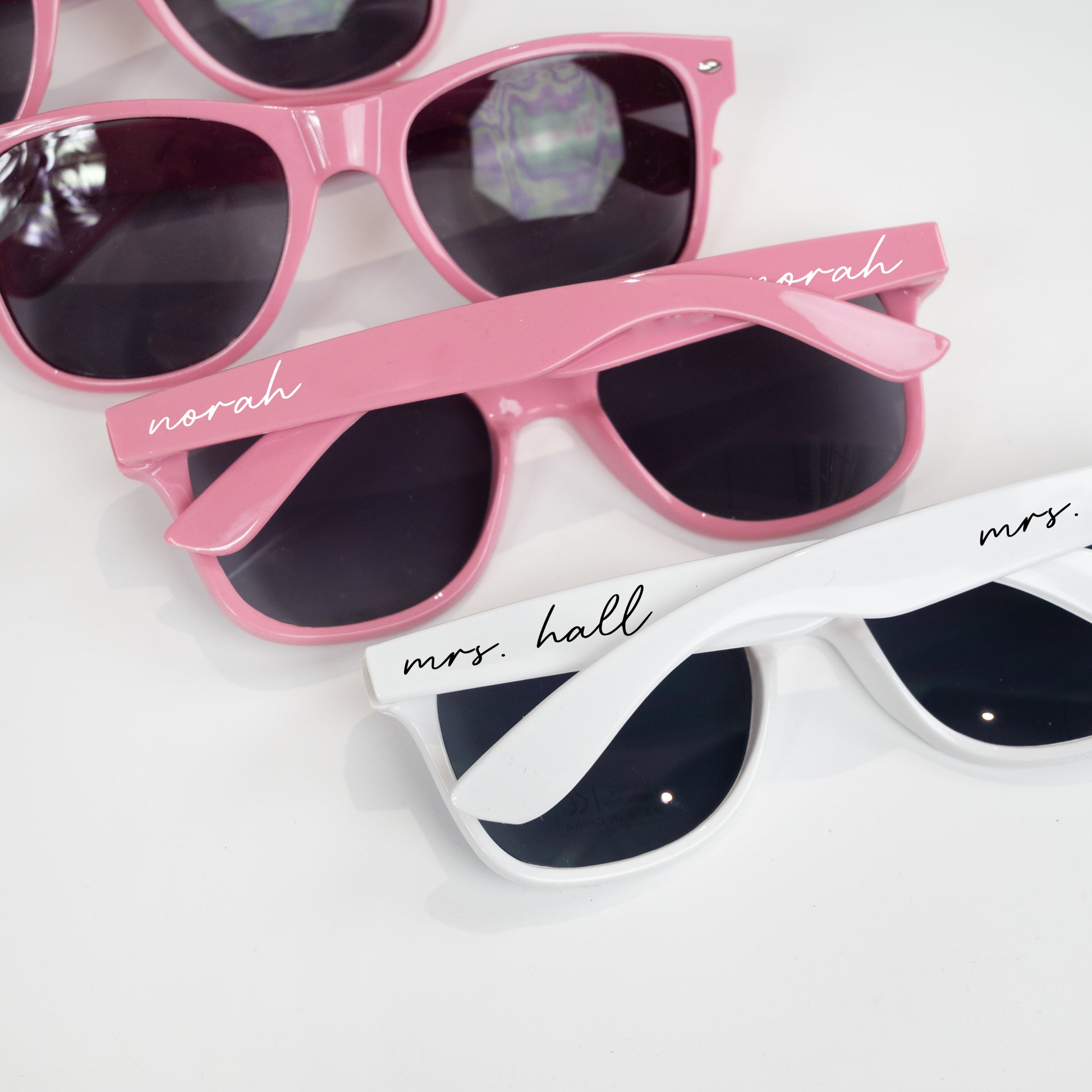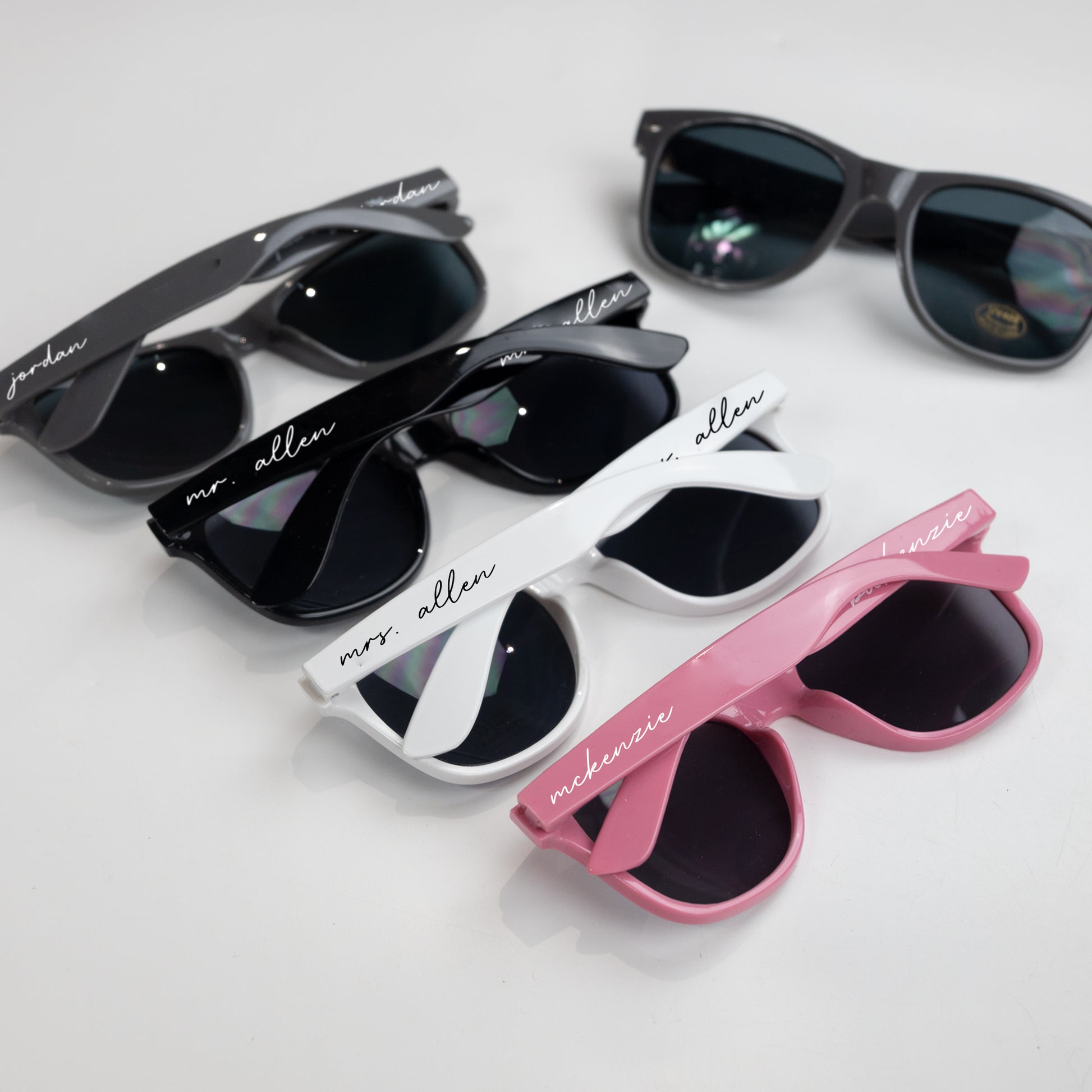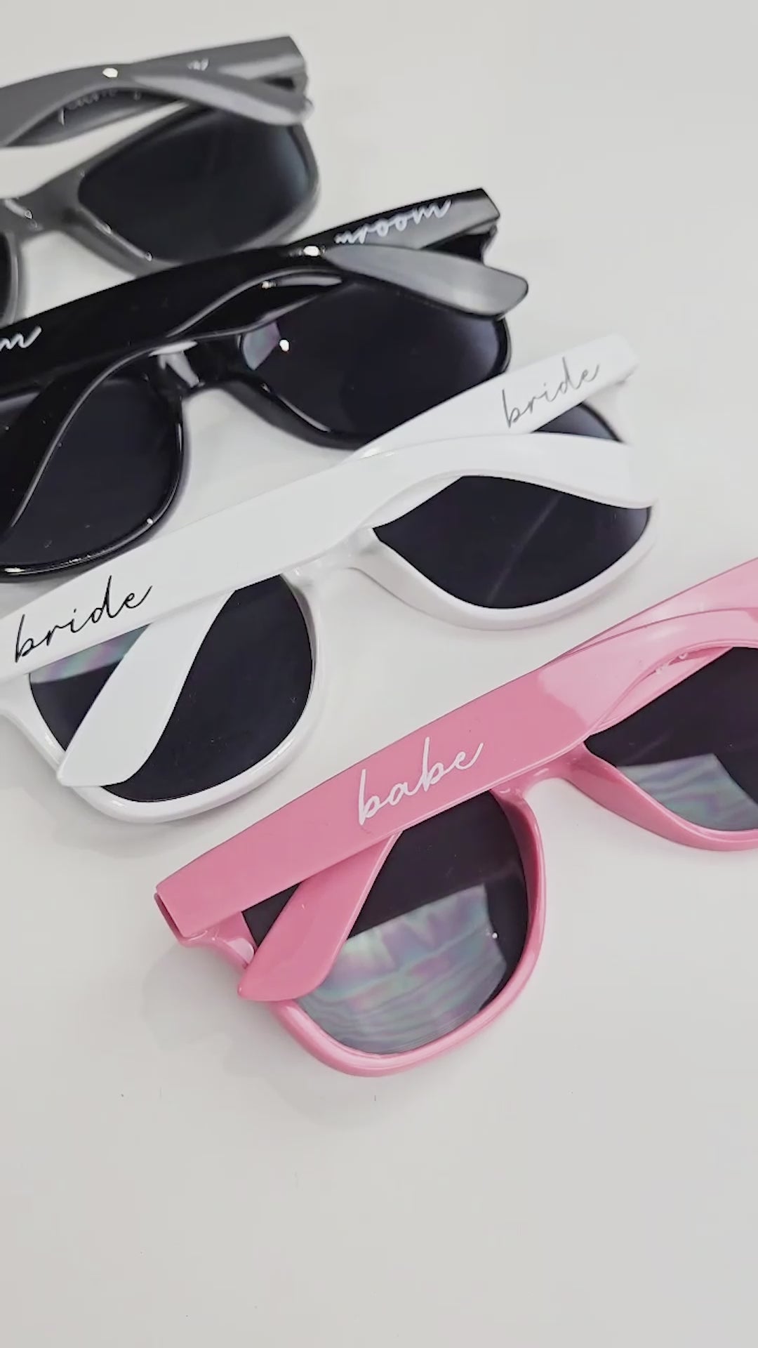 With a bride and groom printed on the side these couple sunglasses, they are the perfect addition for any wedding season celebration. The frames and lenses on these bride and groom sunglasses are made of durable and waterproof plastic material for maximum outdoor fun. They offer protection up to UV 400, so your eyes will stay protected on those bright summer days with these tinted lenses.