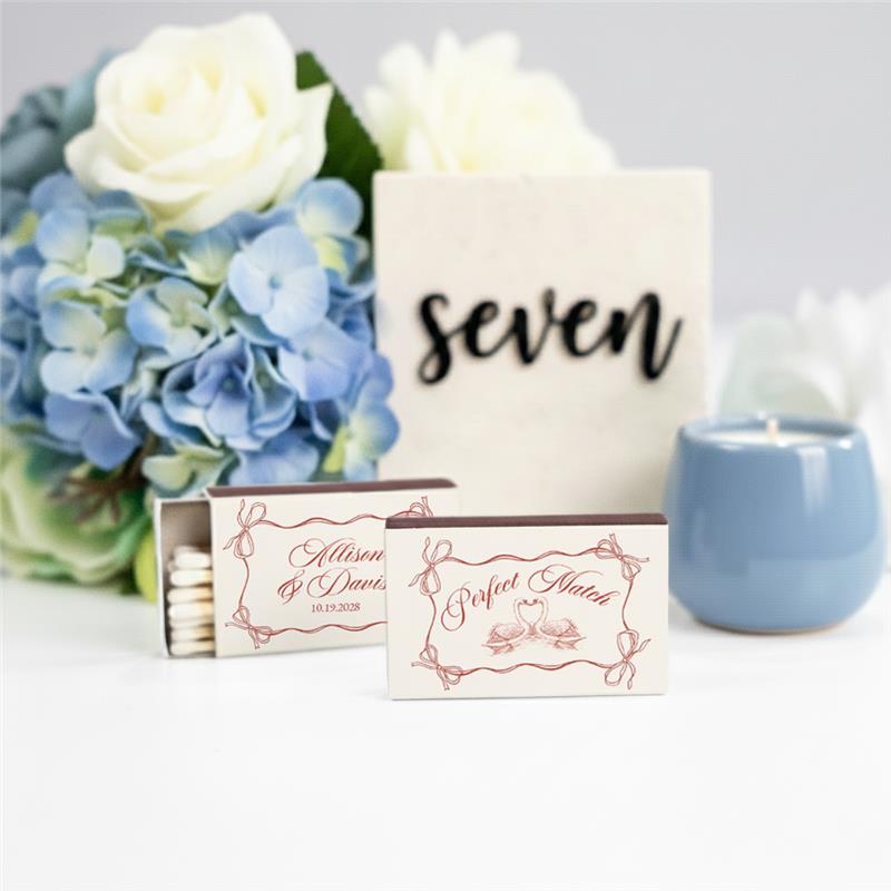 A beautifully vintage illustration of a pair of swans—symbolizing love and partnership—makes this matchbox an elegant wedding keepsake. Personalized with names and date, this design is ideal for classic, romantic, or fairytale-style weddings.