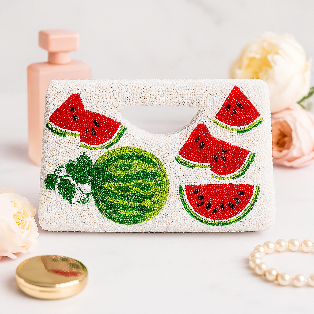 Meet the Watermelon Beaded Handbag, a fun and refreshing accessory perfect for making a bold fashion statement. This handcrafted watermelon purse bag showcases vibrant beadwork, with a playful design featuring juicy red and green hues, accented by delicate black bead "seeds." The intricate detailing brings the summertime charm of watermelon to life, making it a standout handbag for any occasion.