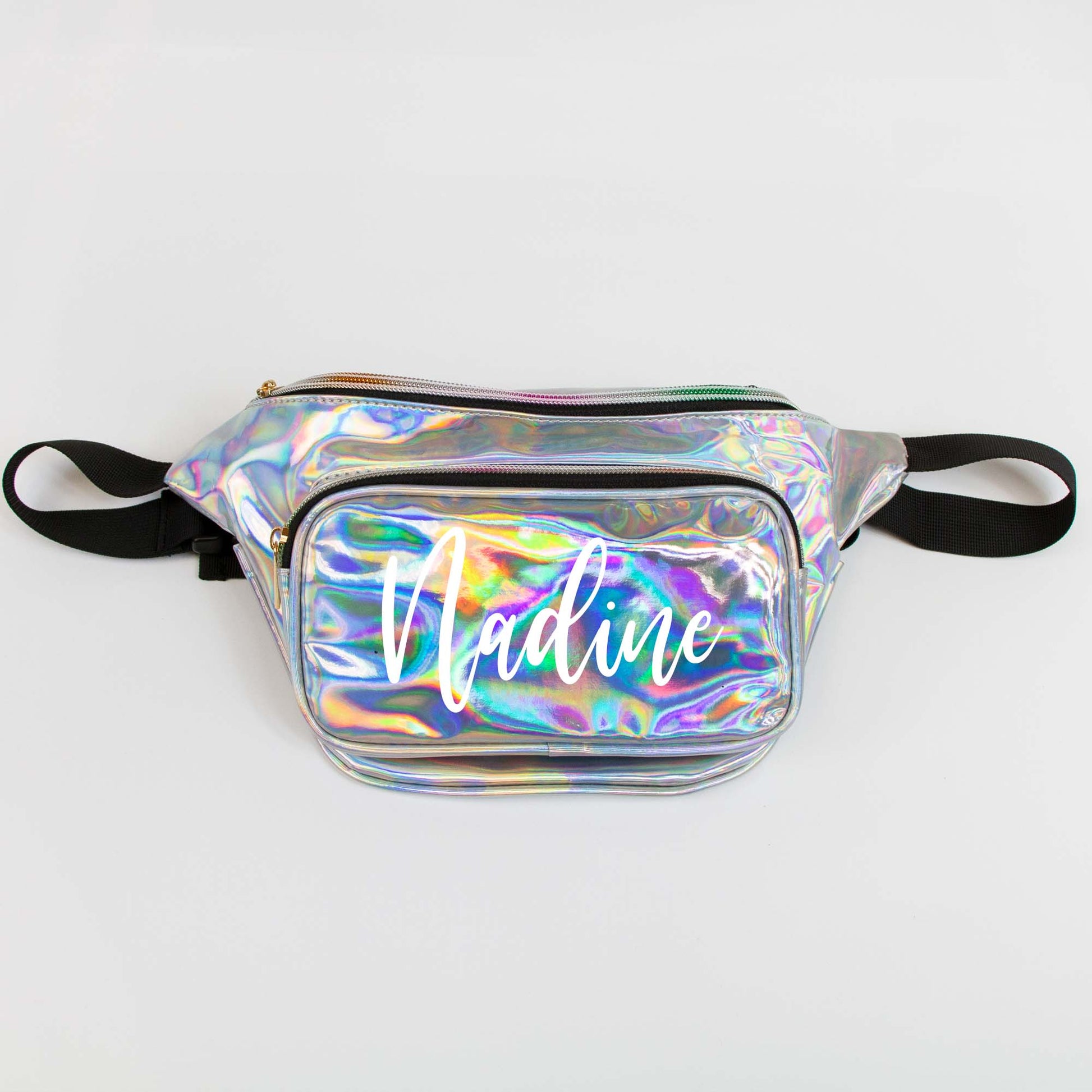 Super cute holographic fanny packs perfect for your next beach vacation, bachelorette party weekend, or pool party. With two pockets that can close with zippers and a hefty strap that can be adjusted, our fanny packs will help carry any essentials so you don’t have to have your hands full. Customization of the front pocket of our fanny packs are also available in a variety of fonts to choose from. Make your next beach bach party unforgettable with uniquely personalized fanny packs.