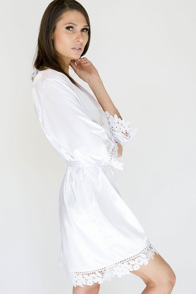 The made-to-order scalloped lace satin robe retains all the qualities you love about a traditional satin robe--soft, comfortable, luxurious--while featuring a slight upgrade to its look. This stylish item is perfect for lounging on your day-offs or for living it up with your girls on a Bachelorette party!