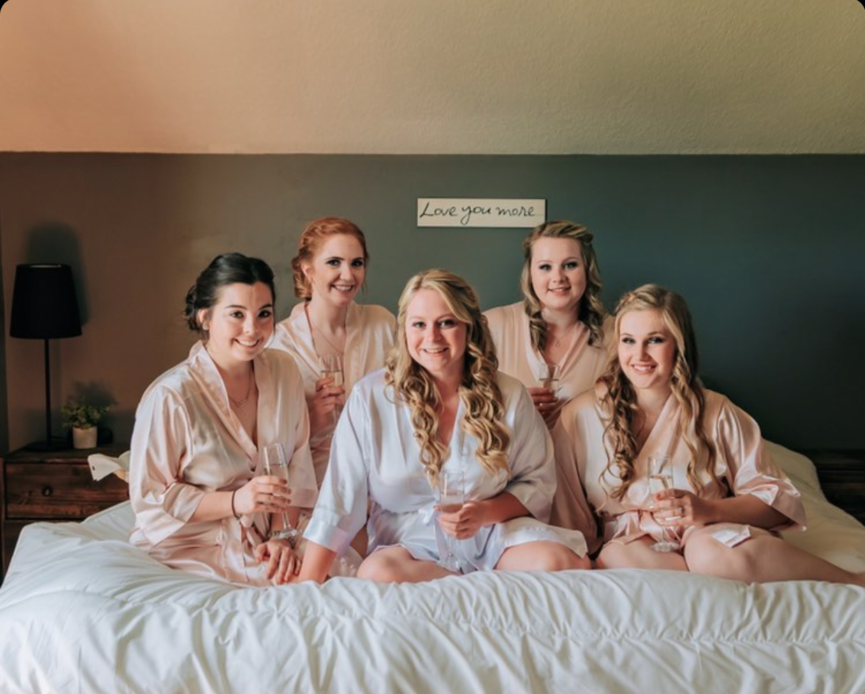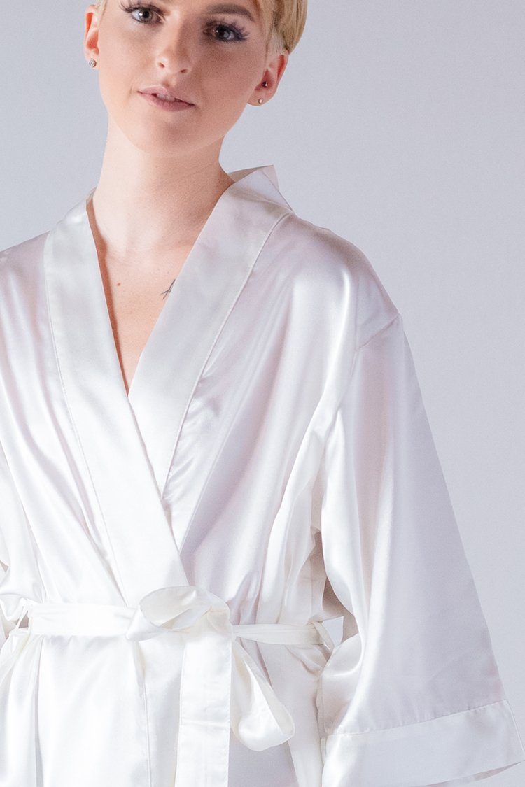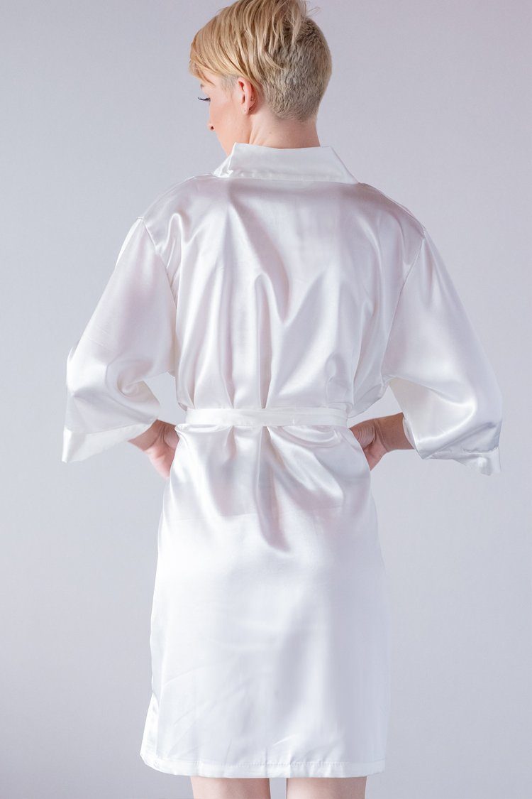 Silky chic and beautifully stitched White Satin Kimono Bridal Robe at an affordable price point. Perfect as a Bridesmaid Robe or favor and available to be customized or shipped as is.